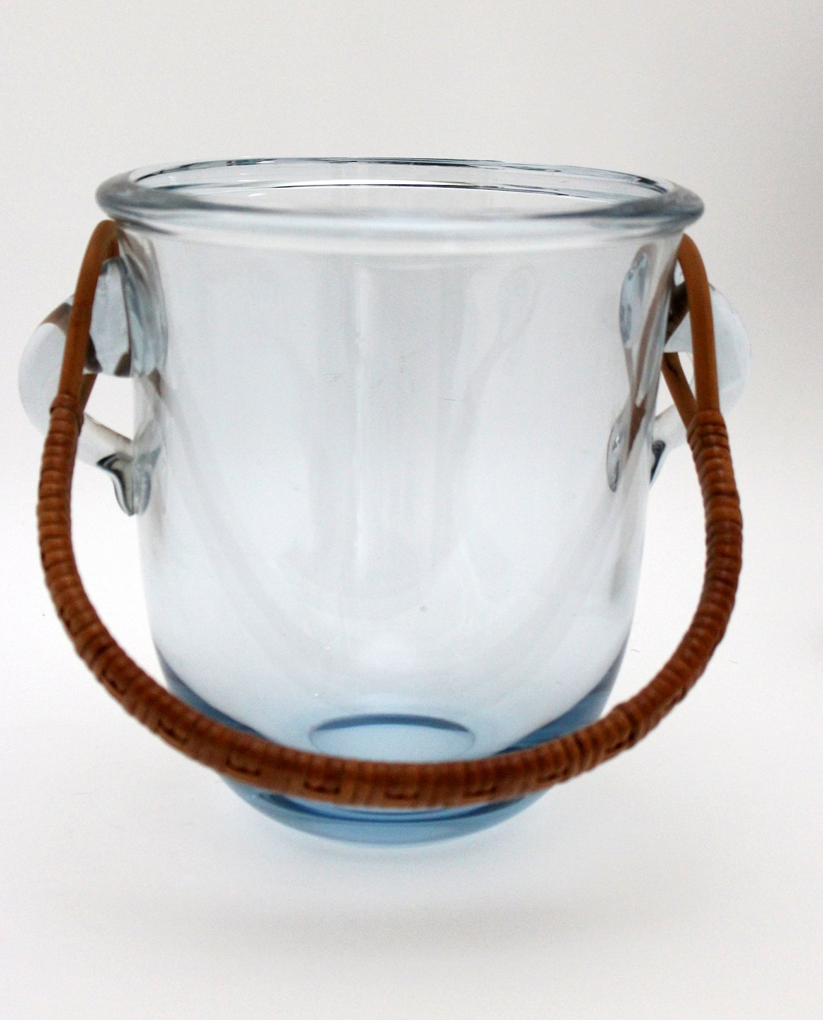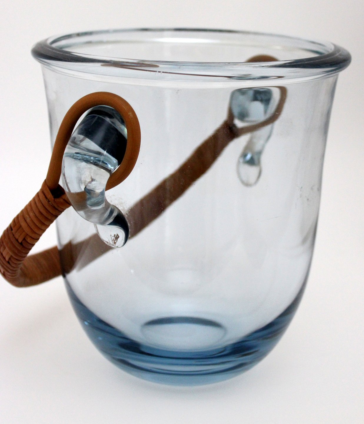 Text zugänglich auf Dänische: Holmegaard, Champagnekøler, stor isspand i transparent aquablå kraftigt glas med basthank. Designet af Jacob E. Bang i 1934. Ingen signatur. Højde 19,5 cm. Øverste diameter 18 cm. Vægt 2 kg. God stand men fremstår med ridser midt på. Pris: 675 kr. stk. Lager: 1