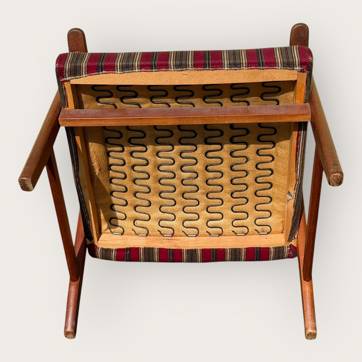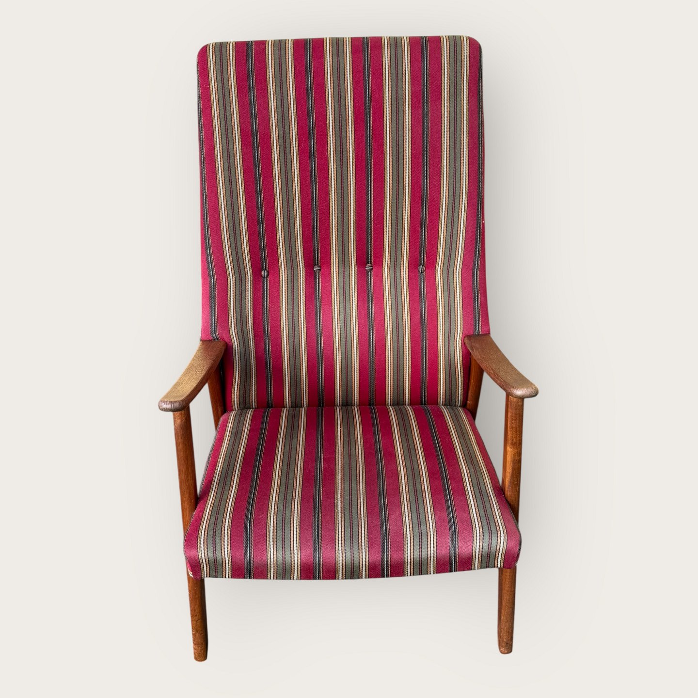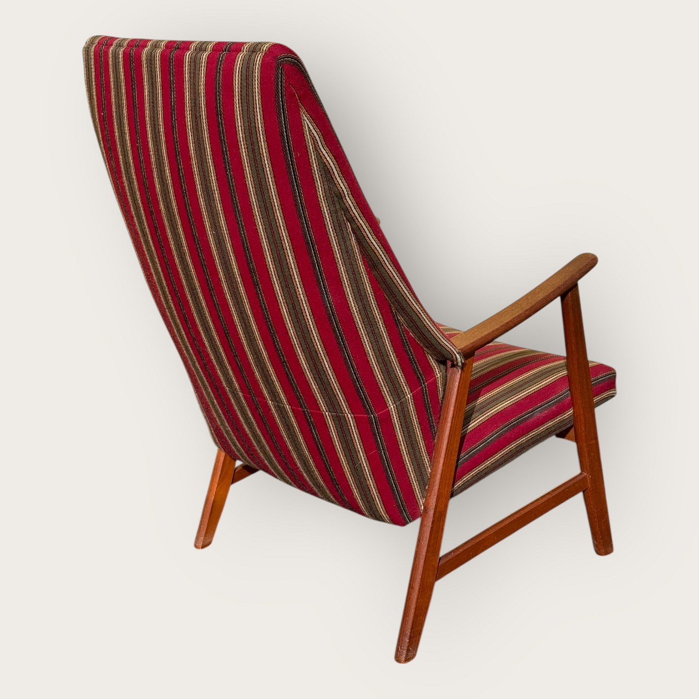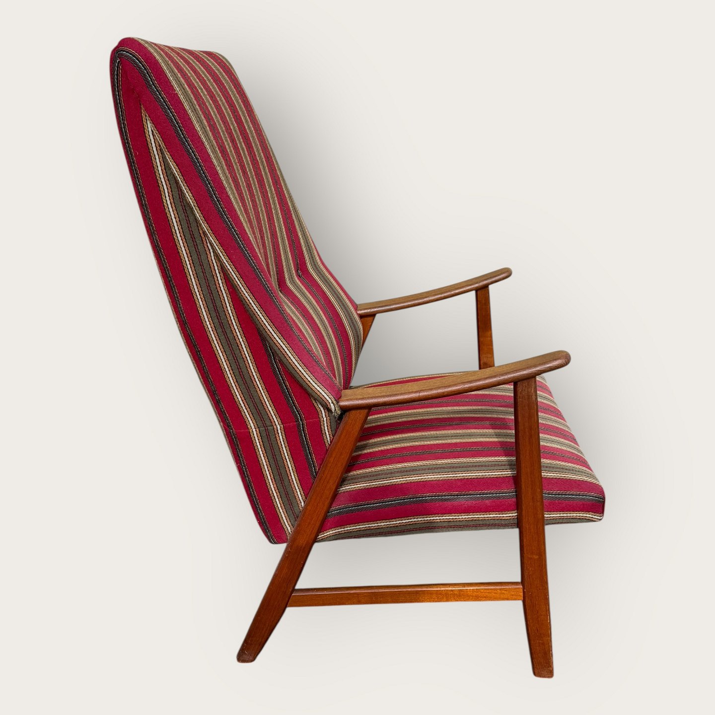 | Sessel aus Teakholz und Stoff, Sitzhöhe 36 cm, Breite 62 cm, Rückenlehnenhöhe 103 cm, skandinavisches Design aus den 1960er Jahren, *guter Zustand*