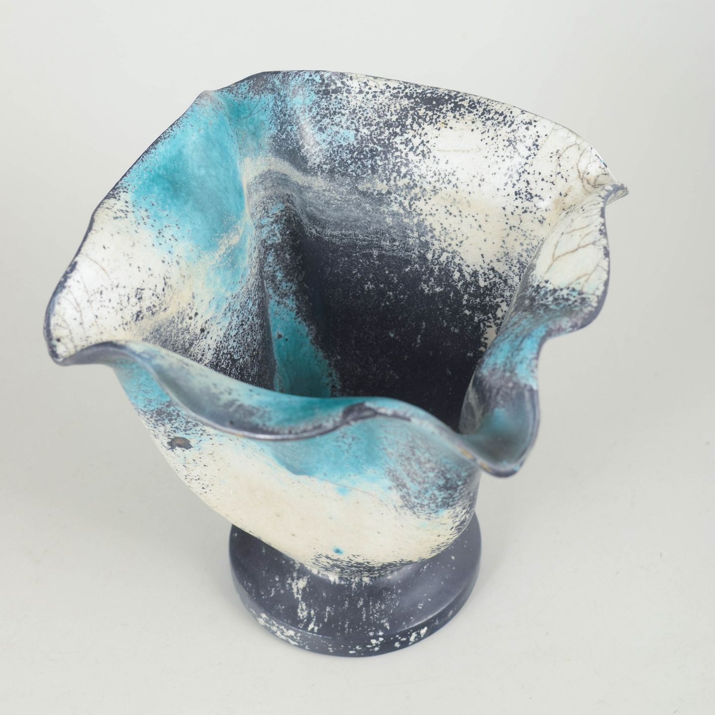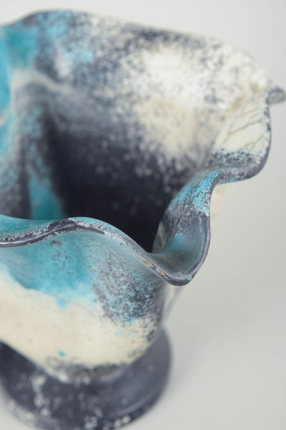 Dekorativ vase i glaseret lertøj med karakteristisk bølget rand og fod. Udført i dobbeltglasur med grønne, turkise, hvide og sorte nuancer, hvor glasuren flyder levende over formen og skaber et markant kunstnerisk udtryk.