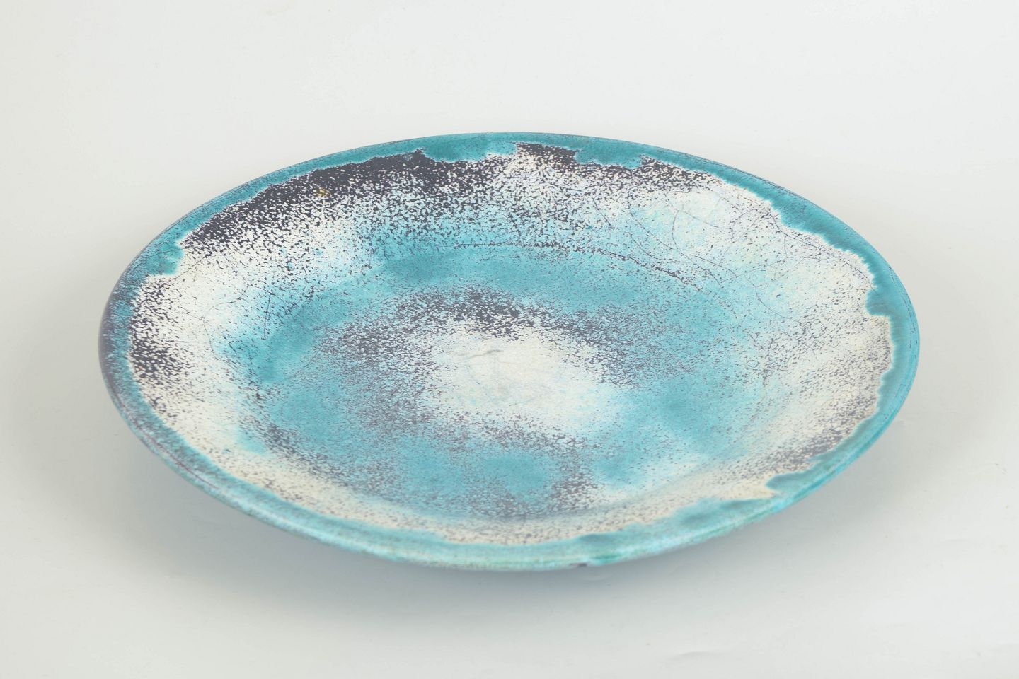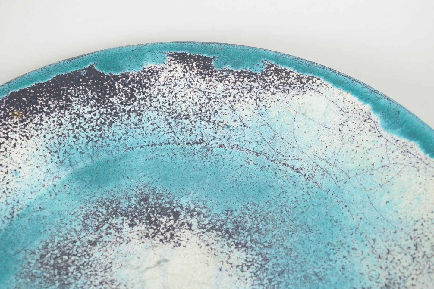 Stort rundt fad i glaseret lertøj med karakteristisk dobbeltglasur i grønne, turkise og sorte nuancer. Overfladen fremstår med levende spil og let krakelering, typisk for Hammershøis eksperimenterende glasurteknik. Signeret HAK i bunden.