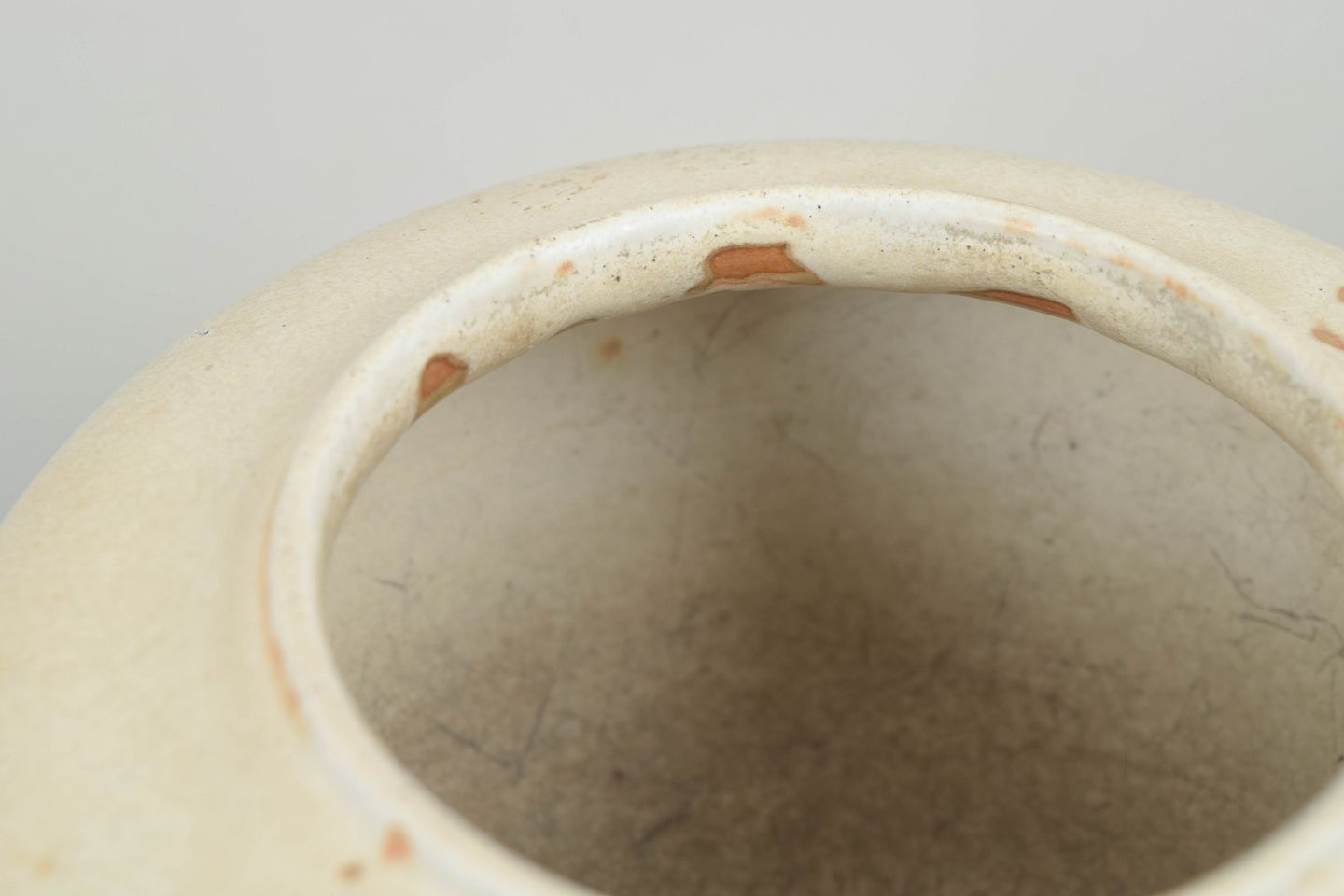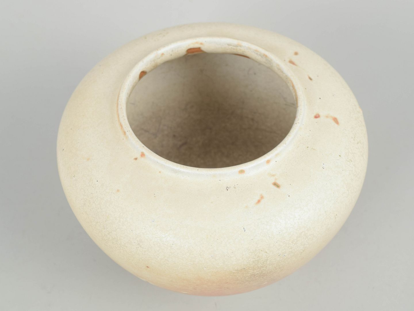 Rund korpusformet krukke i stentøj med blød, mat glasur i lyse nuancer med rosa toner og fine variationer i overfladen.