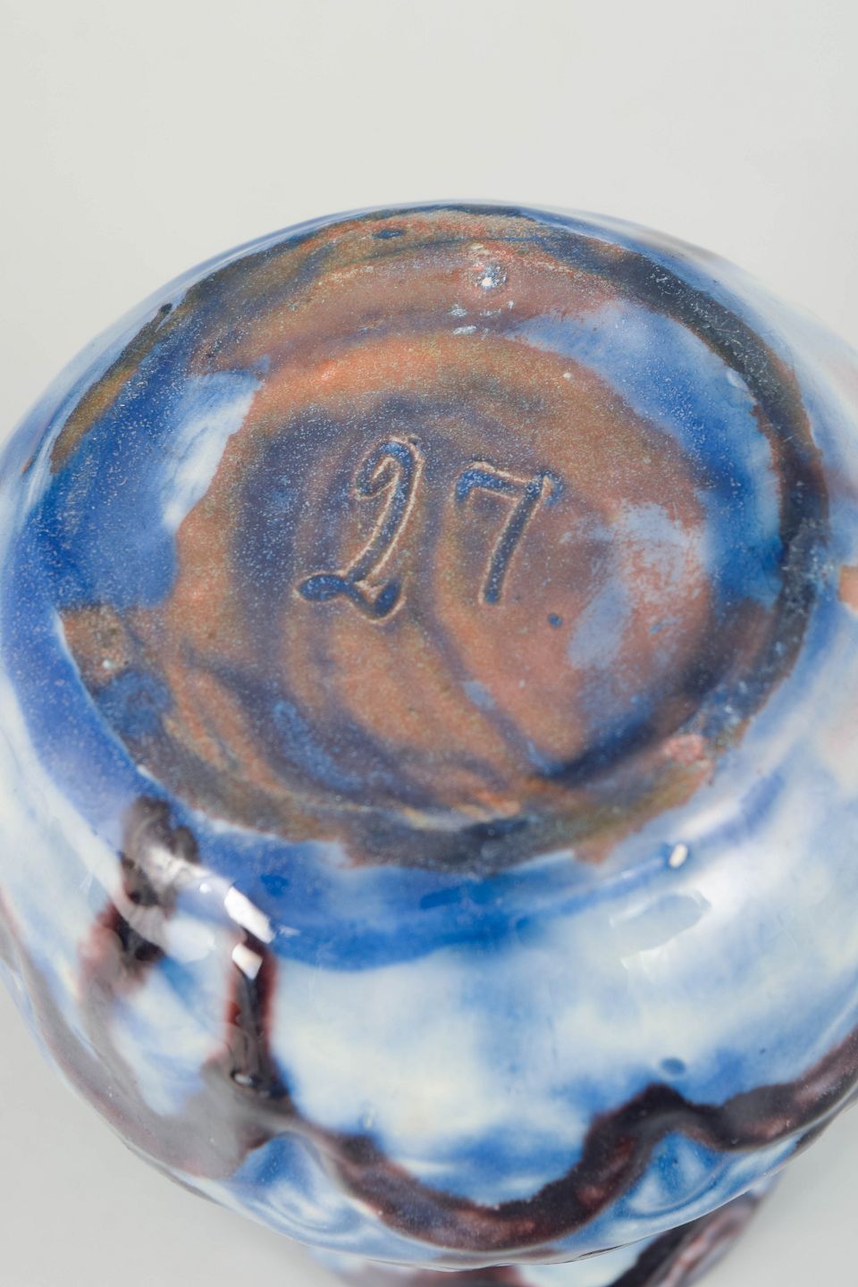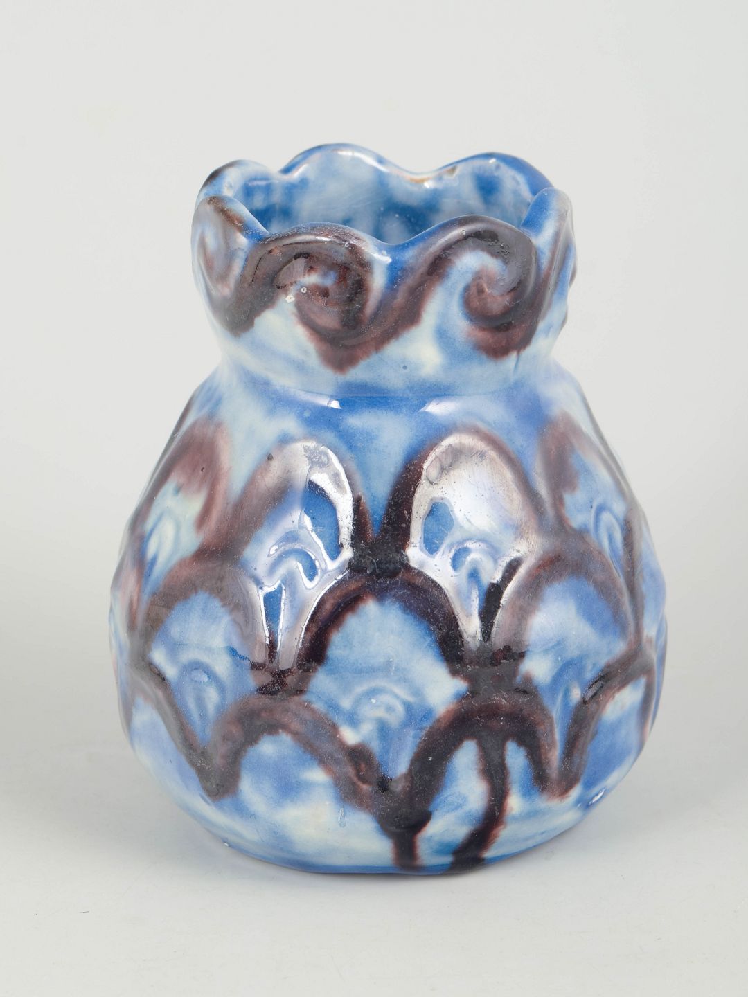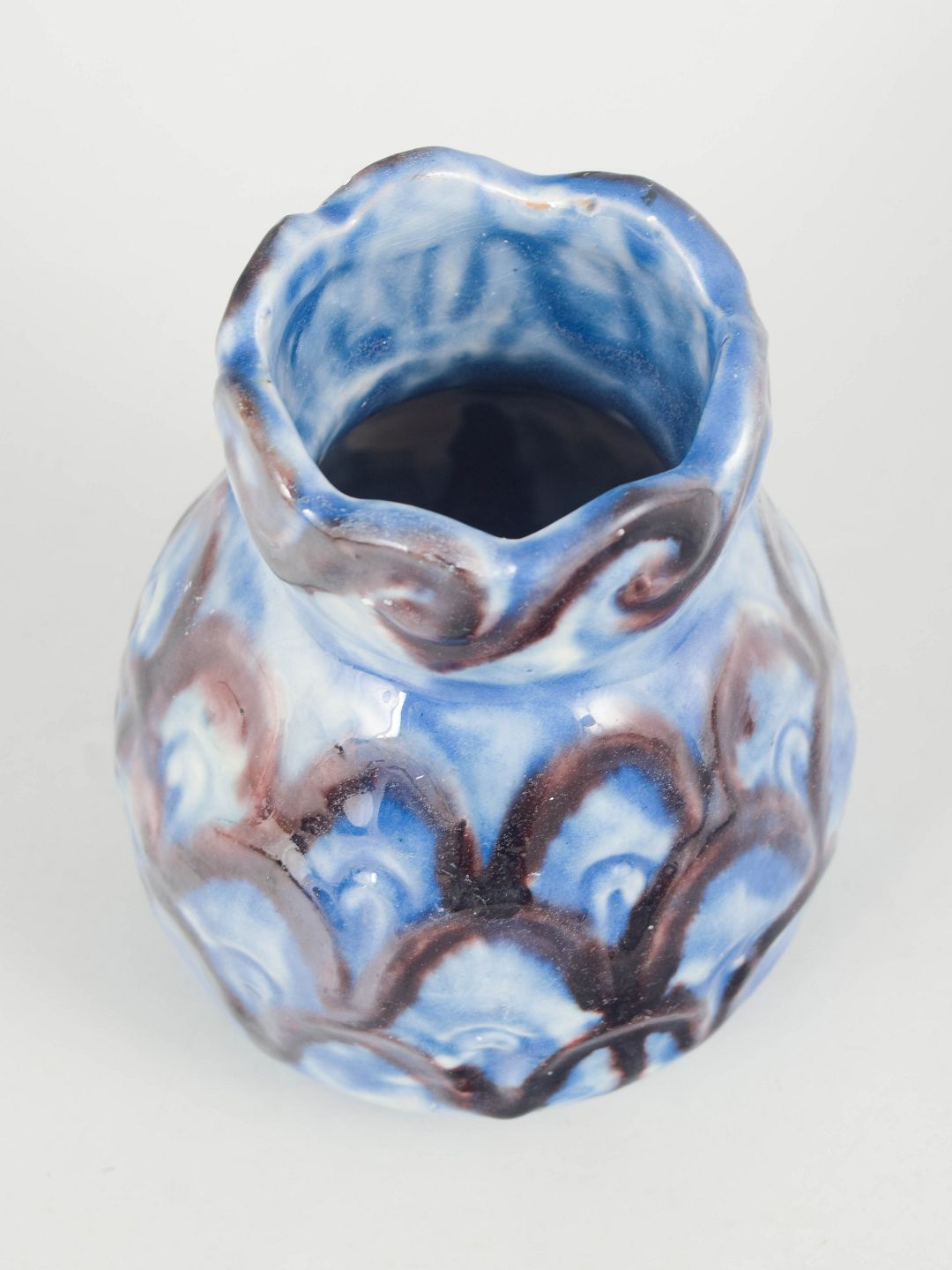 Dekorativ vase i fajance med rillet, organisk form og karakteristisk bølget rand. Udført med den såkaldte bølledekoration i blå og brun glasur på lys bund, typisk for fabrikkens produktion i mellemkrigstiden.