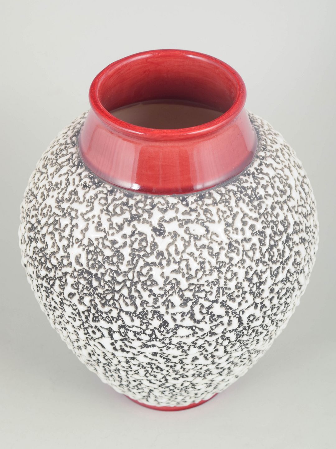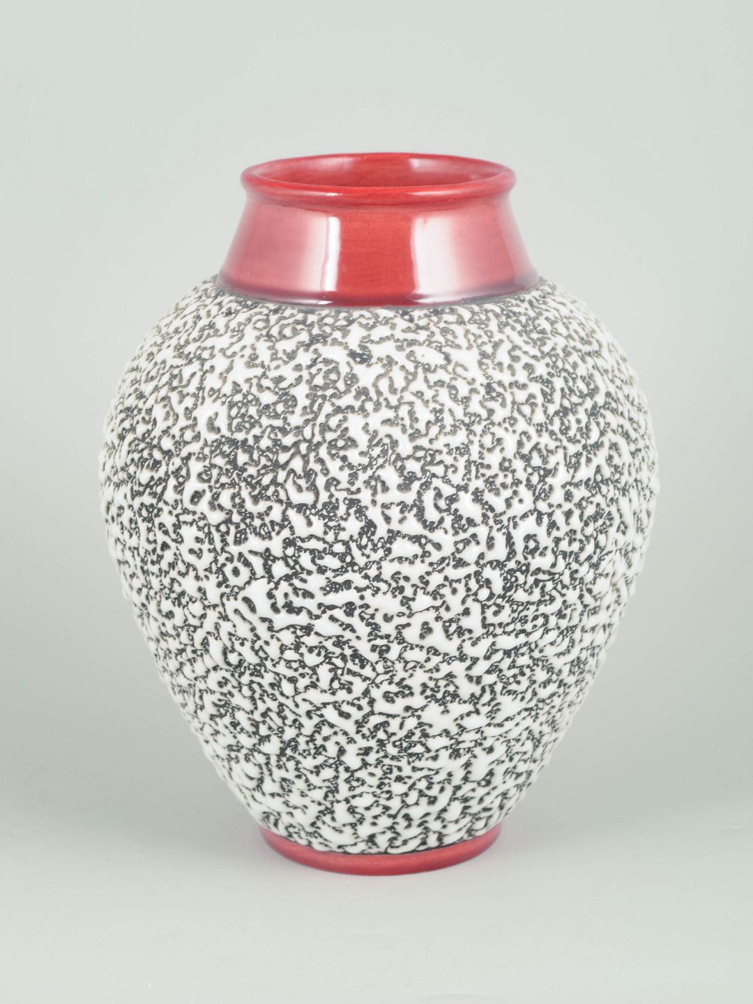 Art Deco-vase i keramik med balusterform, dekoreret med tæt sort abstrakt mønster på hvid bund samt pinkrød glasur på hals og fod. Signeret.