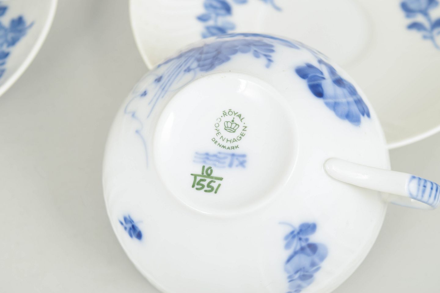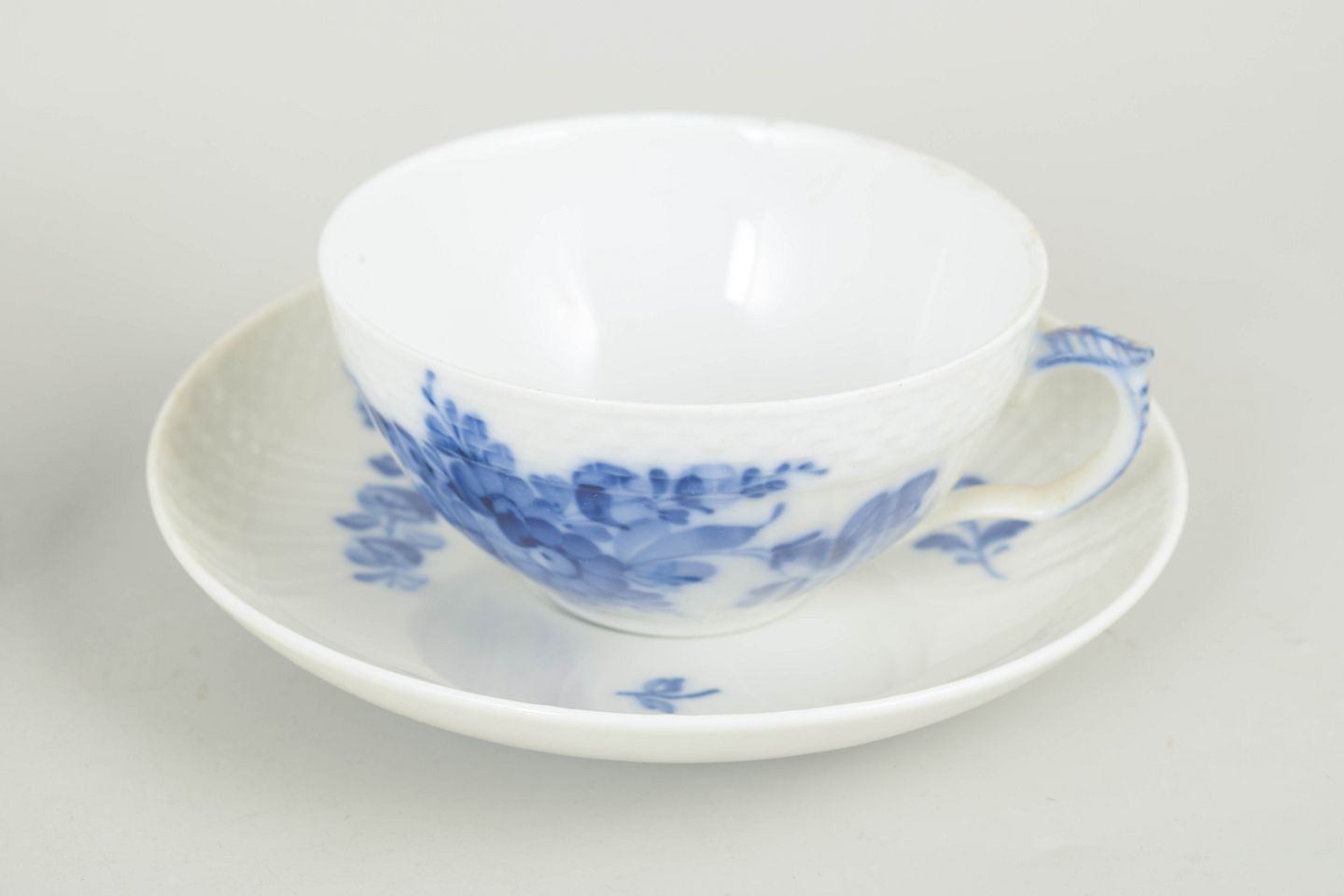 Sæt bestående af to tekopper med matchende underkopper i porcelæn, dekoreret med håndmalet blå blomsterdekoration i relief. Modelnummer 10/1551, 1. sortering, fra 1990’erne.