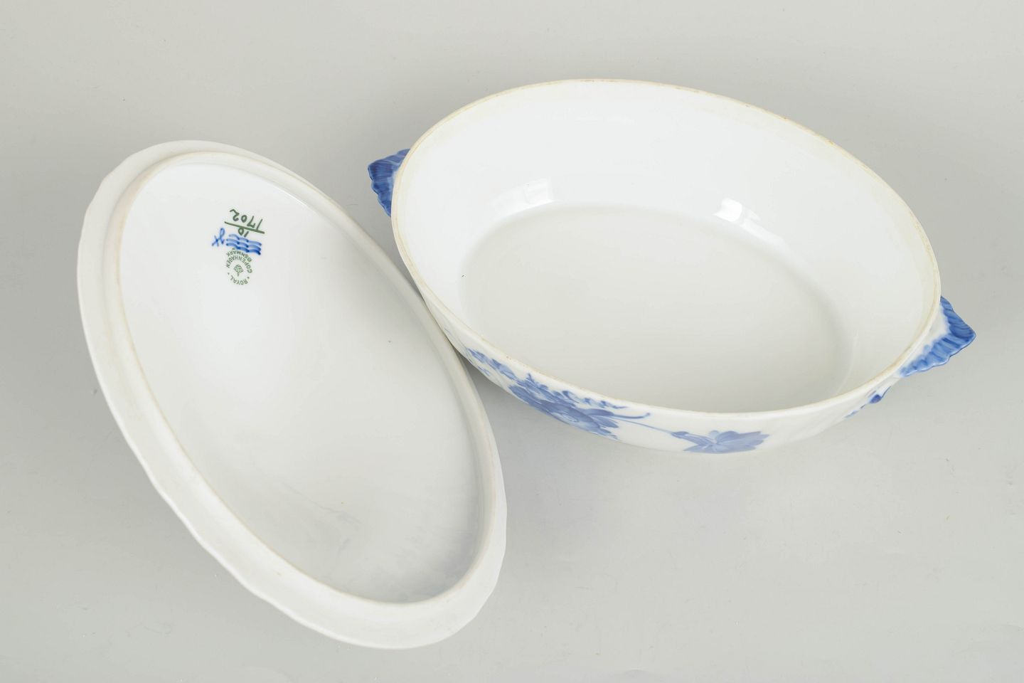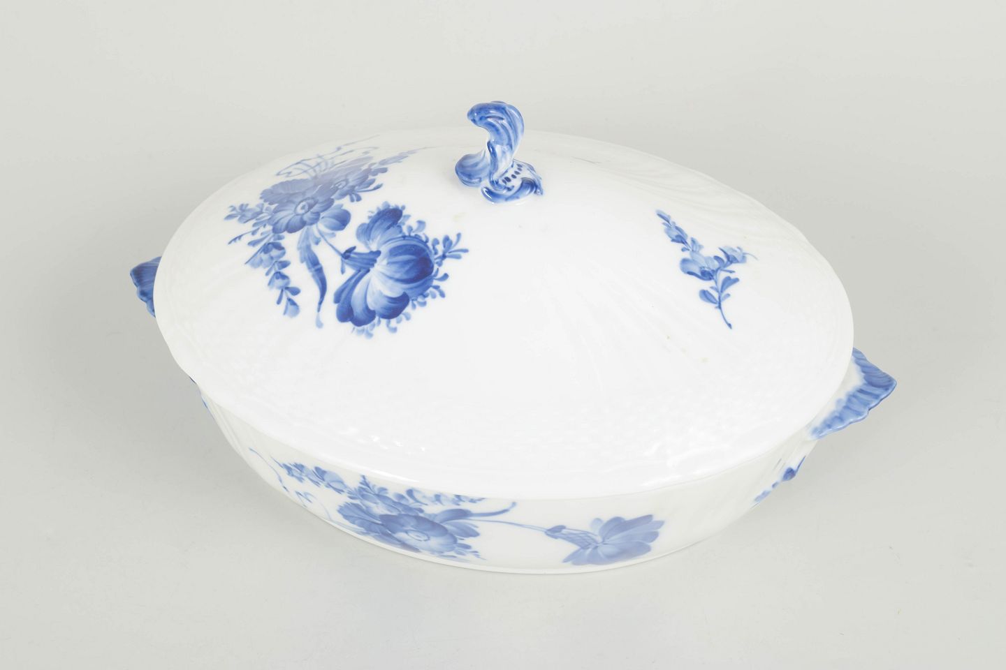 Text zugänglich auf Dänische: Royal Copenhagen, Blå Blomst Svejset oval terrin med låg.