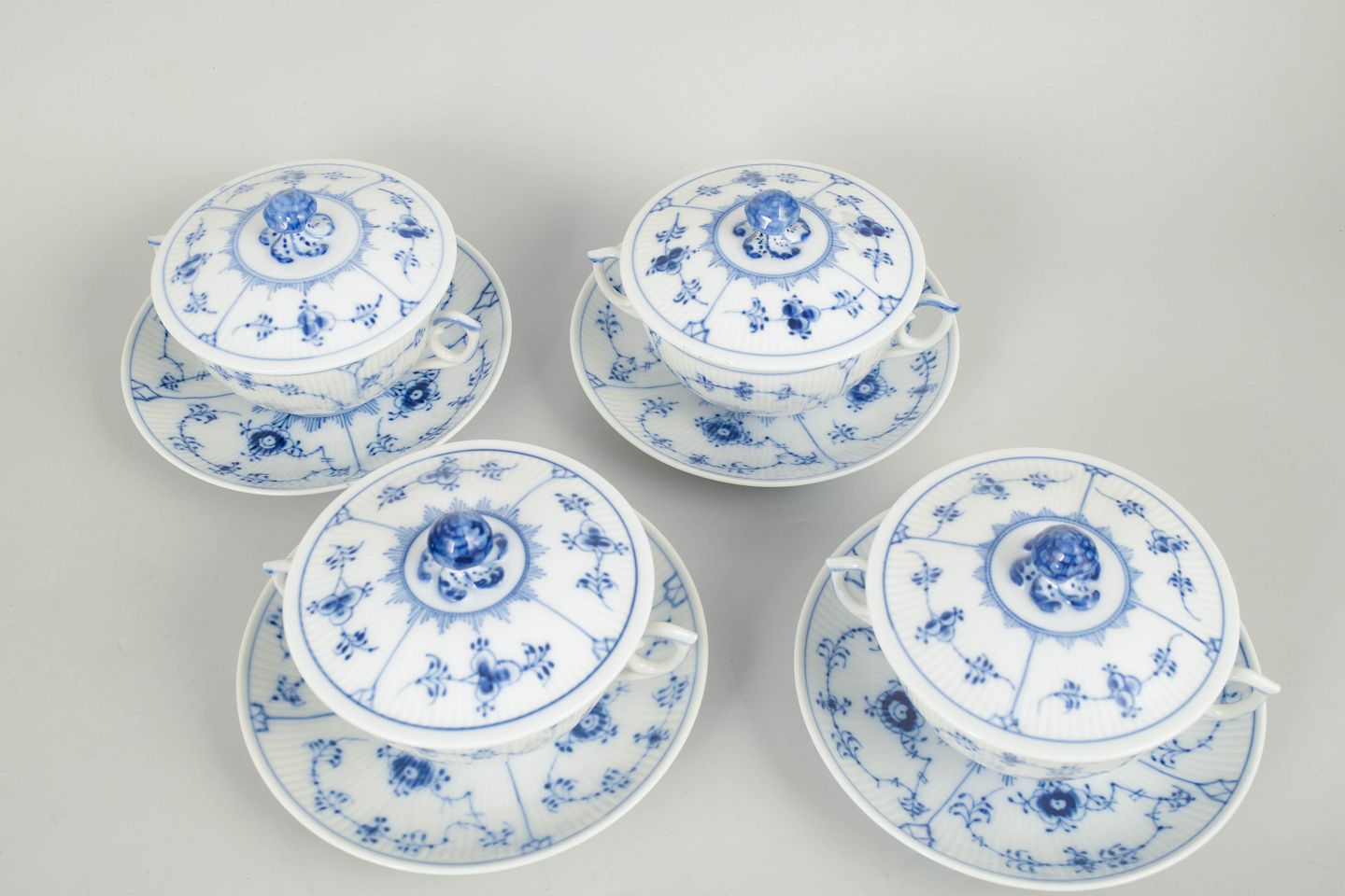 Royal Copenhagen, musselmalet riflet sæt af fire bouillonkopper med underkopper.