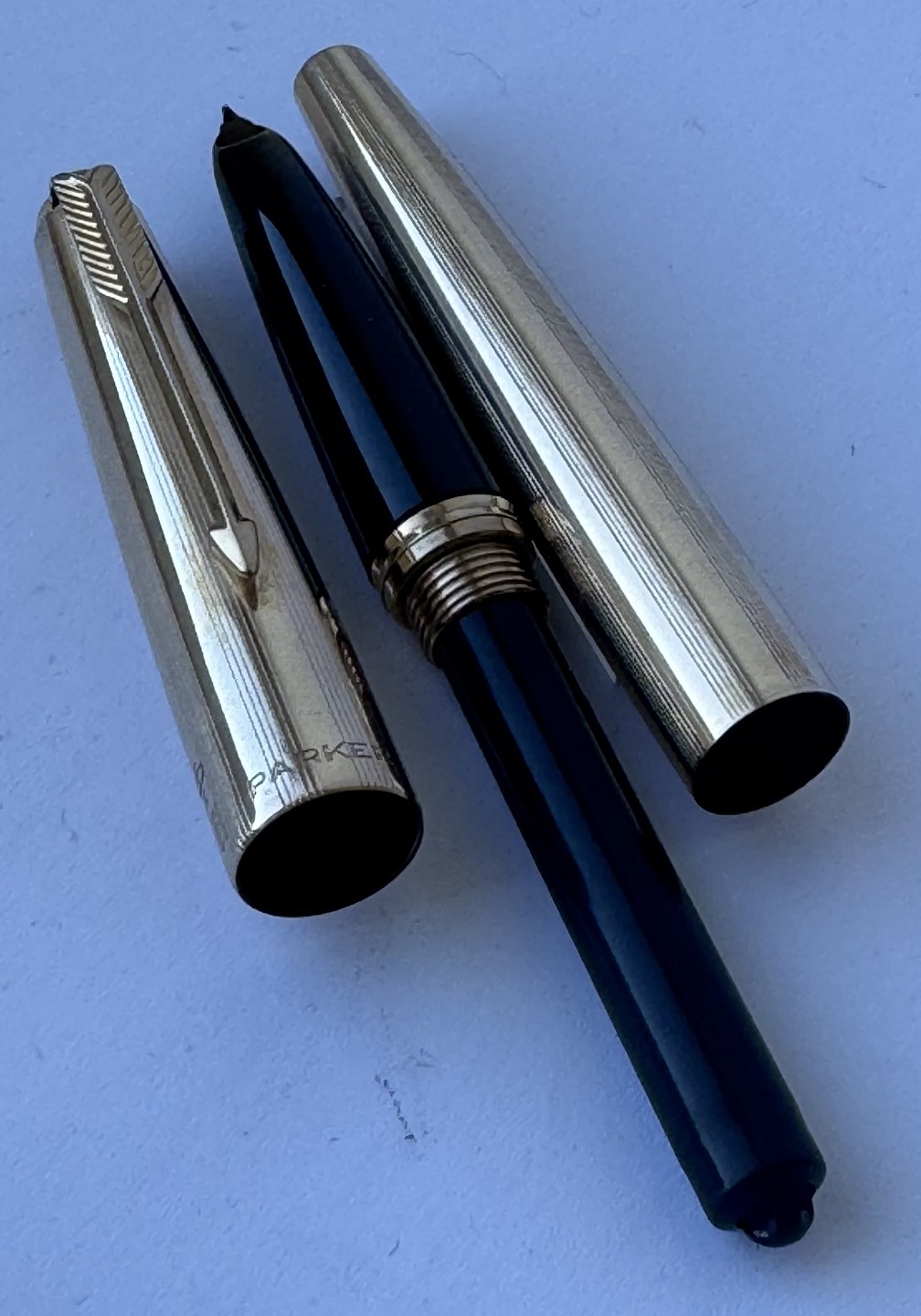Guld-double Parker 61 fyldepen. Klar til at blive brugt. Fremstår i god og funktionsdygtig stand. Brugt meget lidt. Ingen særlige brugsspor. L. 13,3 cm