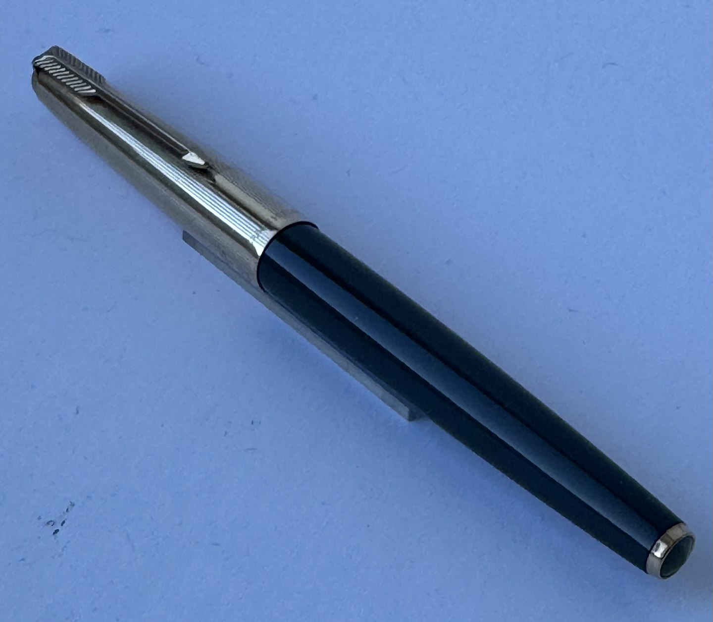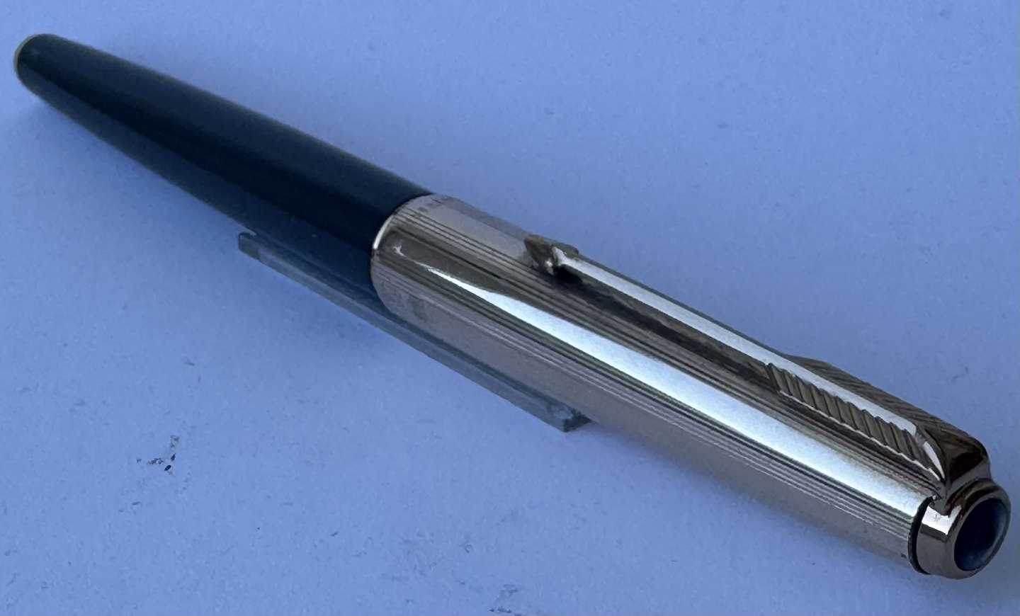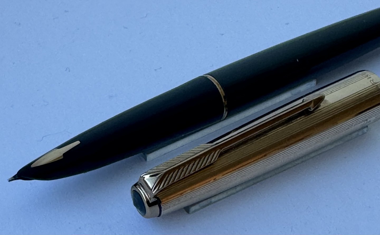 Grå Parker 61 fyldepen med guld-double hætte. Klar til at blive brugt. Fremstår i god og funktionsdygtig stand. Brugt meget lidt. Ingen særlige brugsspor. L. 13,3 cm