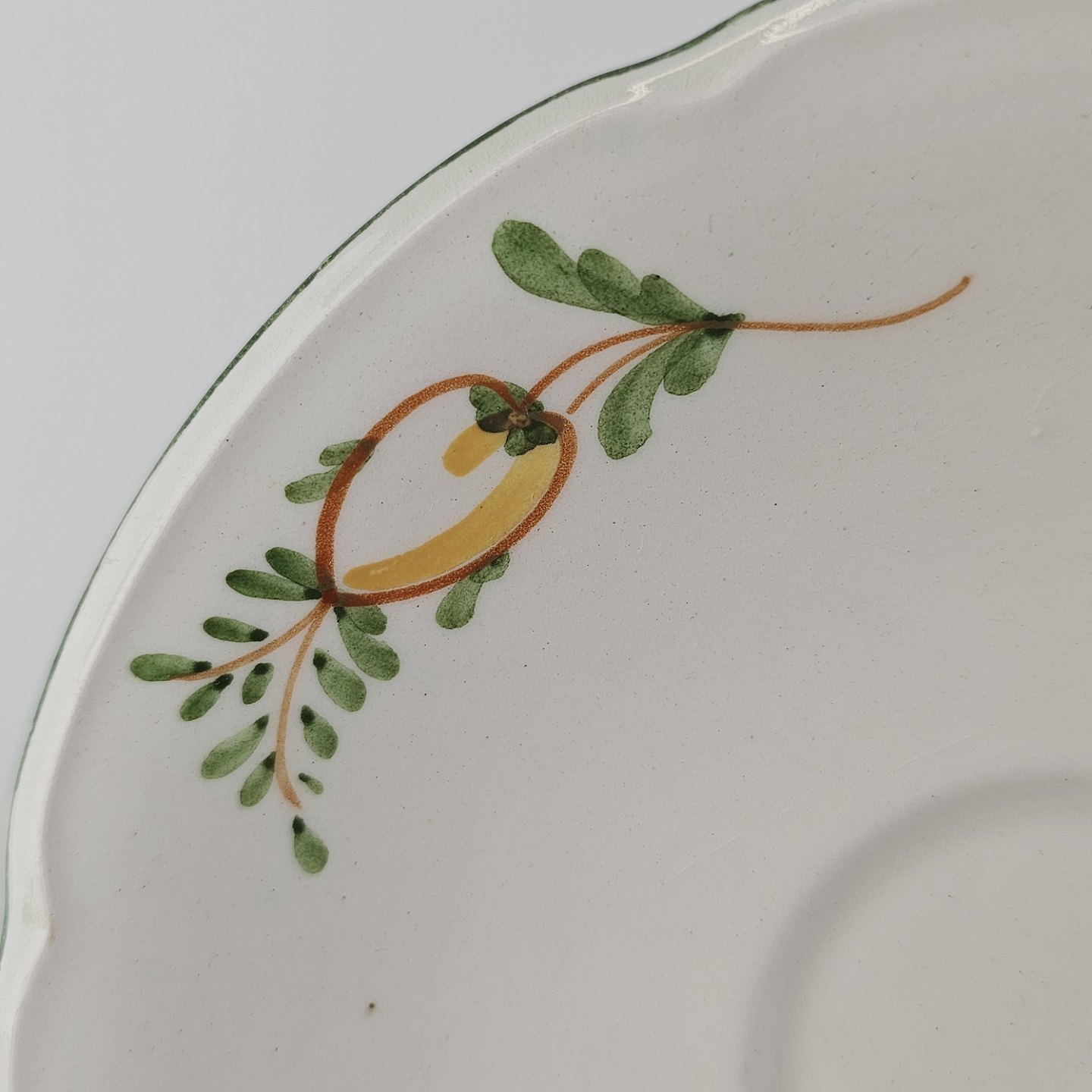 Hvidt fajancestel i stelform Feston/Alma med motiv af gule blomster og grønne blade.