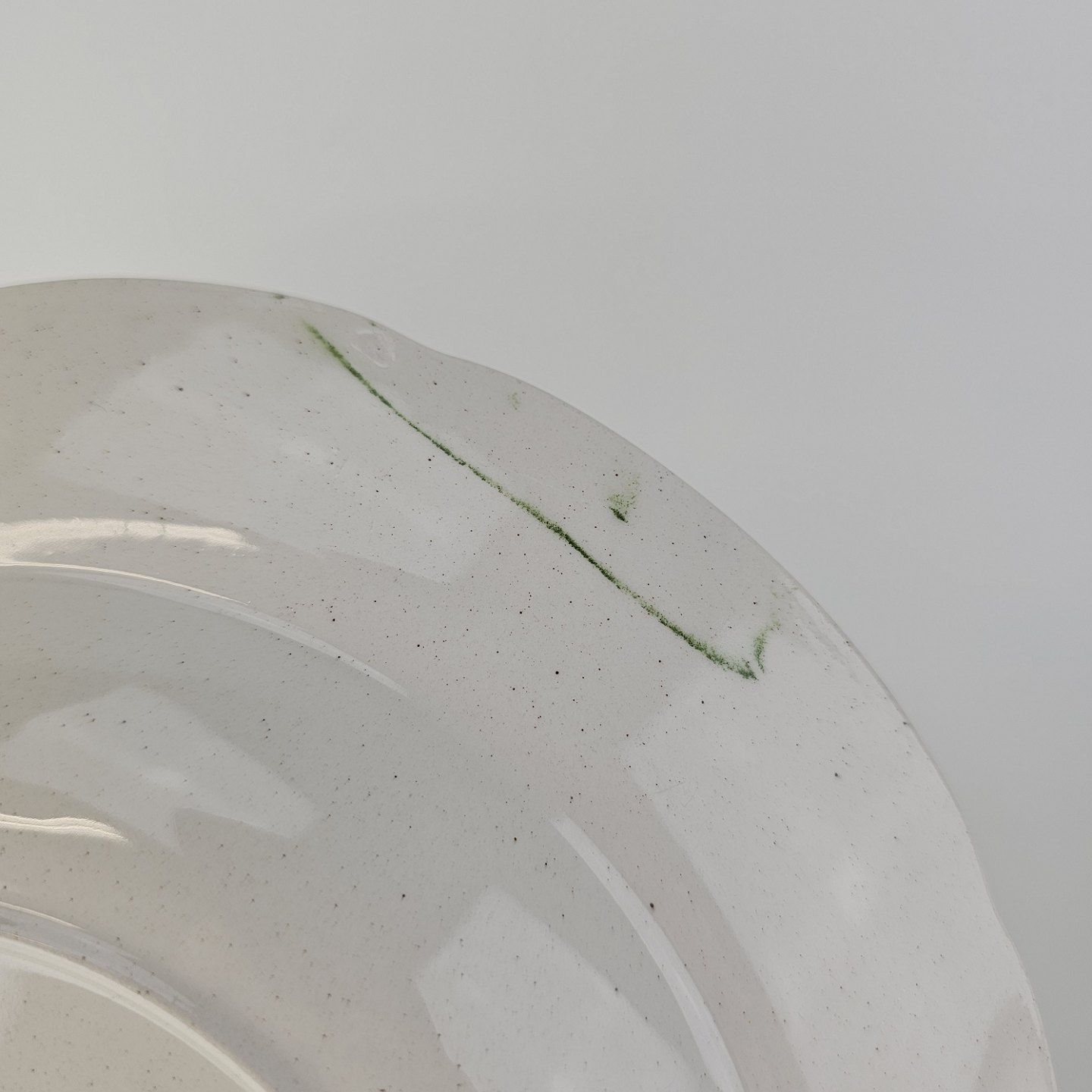 Fremstår med små sorte prikker i glasuren.