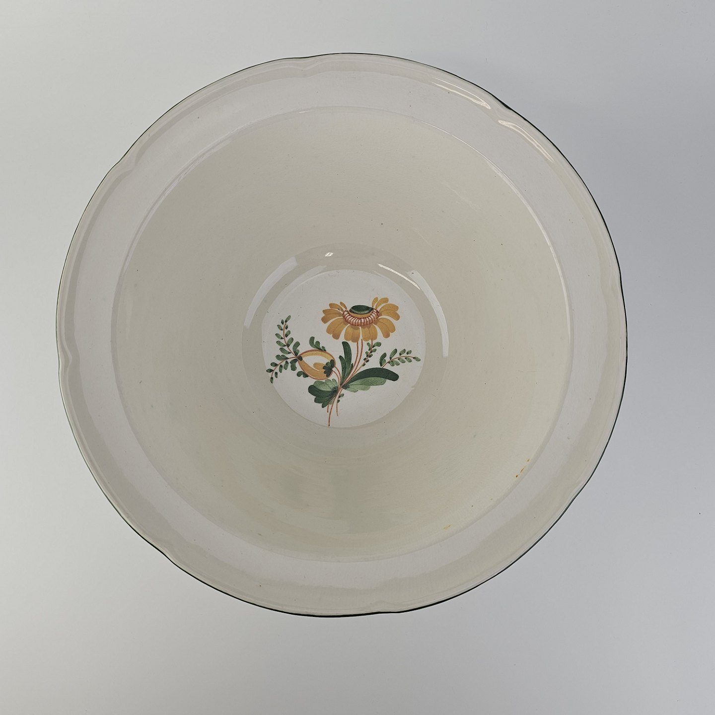 Hvidt fajancestel i stelform Feston/Alma med motiv af gule blomster og grønne blade.