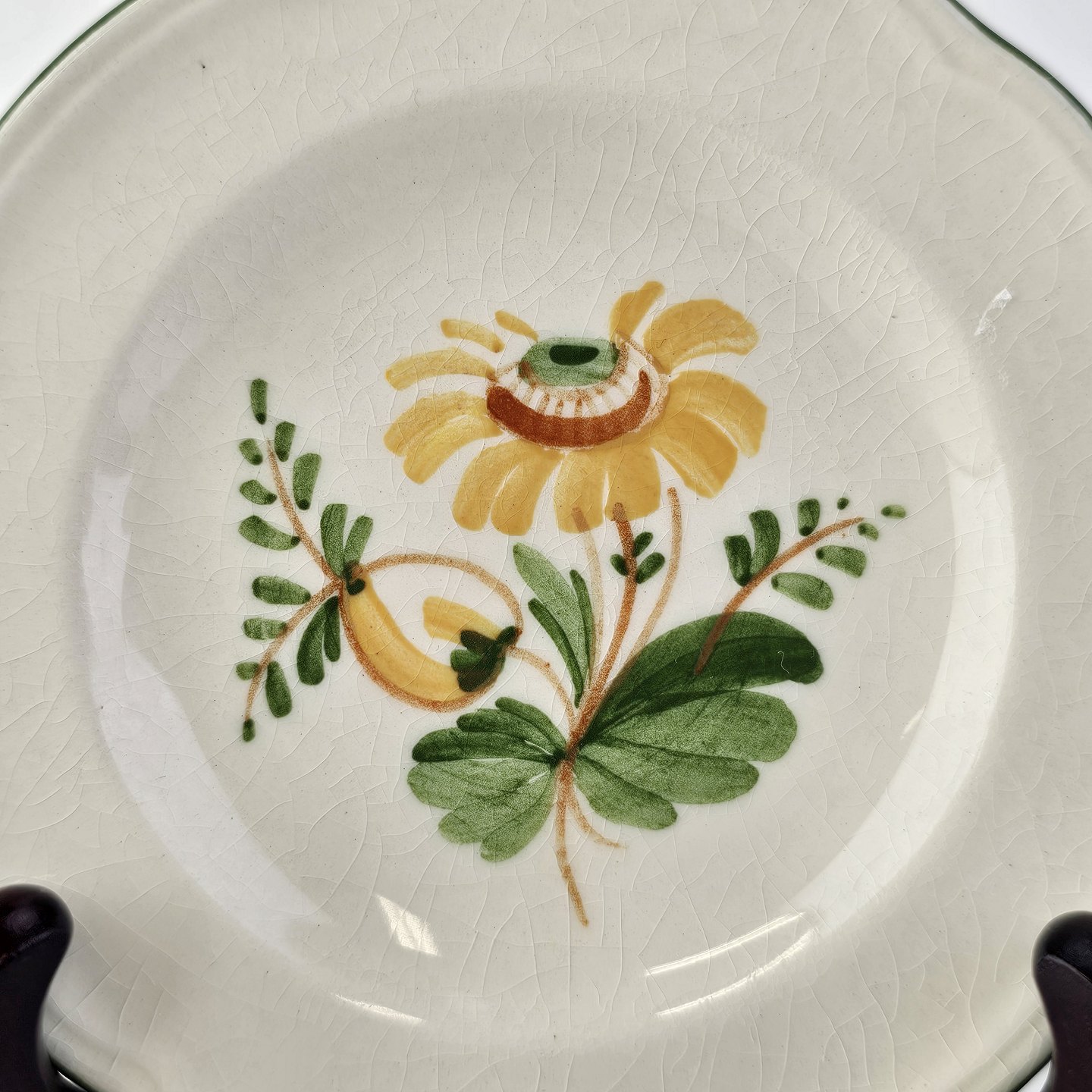 Hvidt fajancestel i stelform Feston/Alma med motiv af gule blomster og grønne blade.