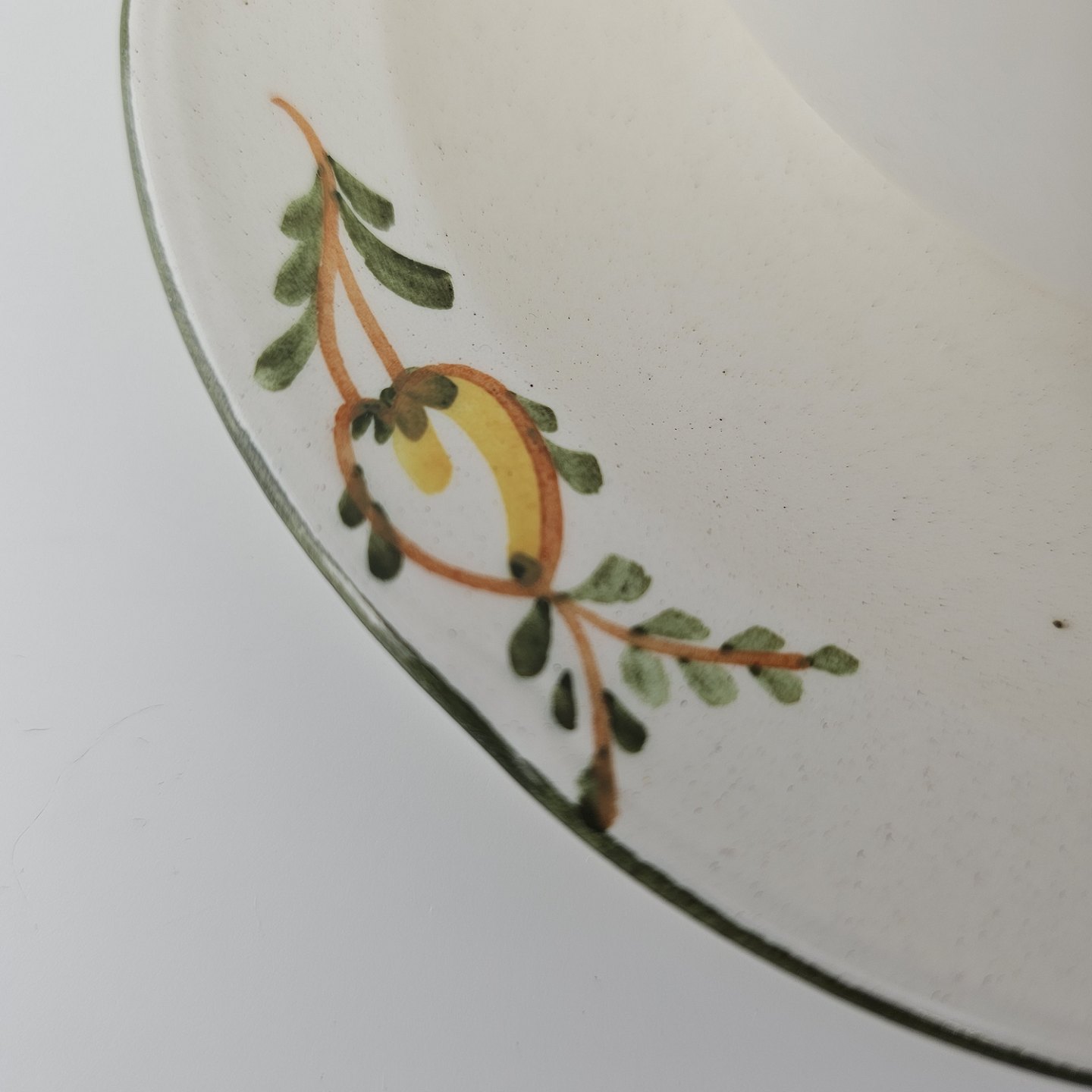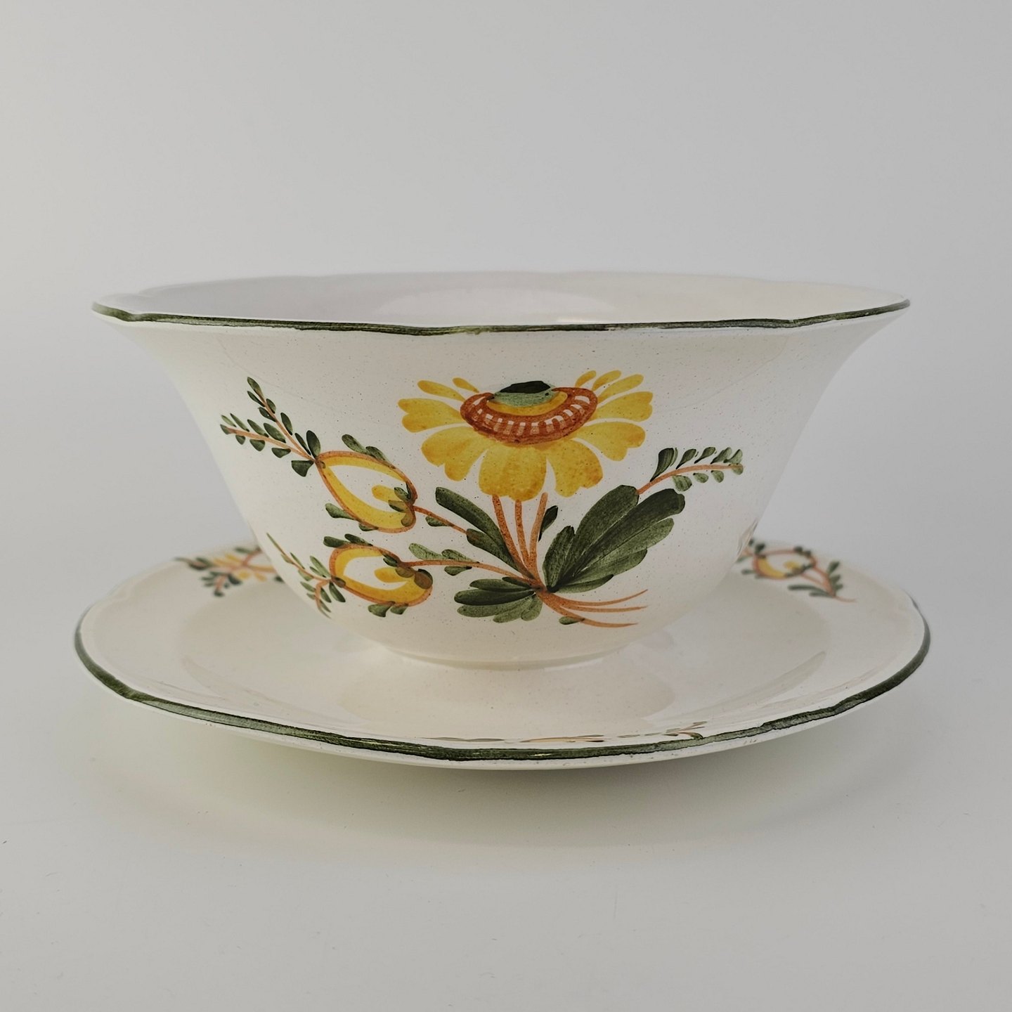 Hvidt fajancestel i stelform Feston/Alma med motiv af gule blomster og grønne blade.
