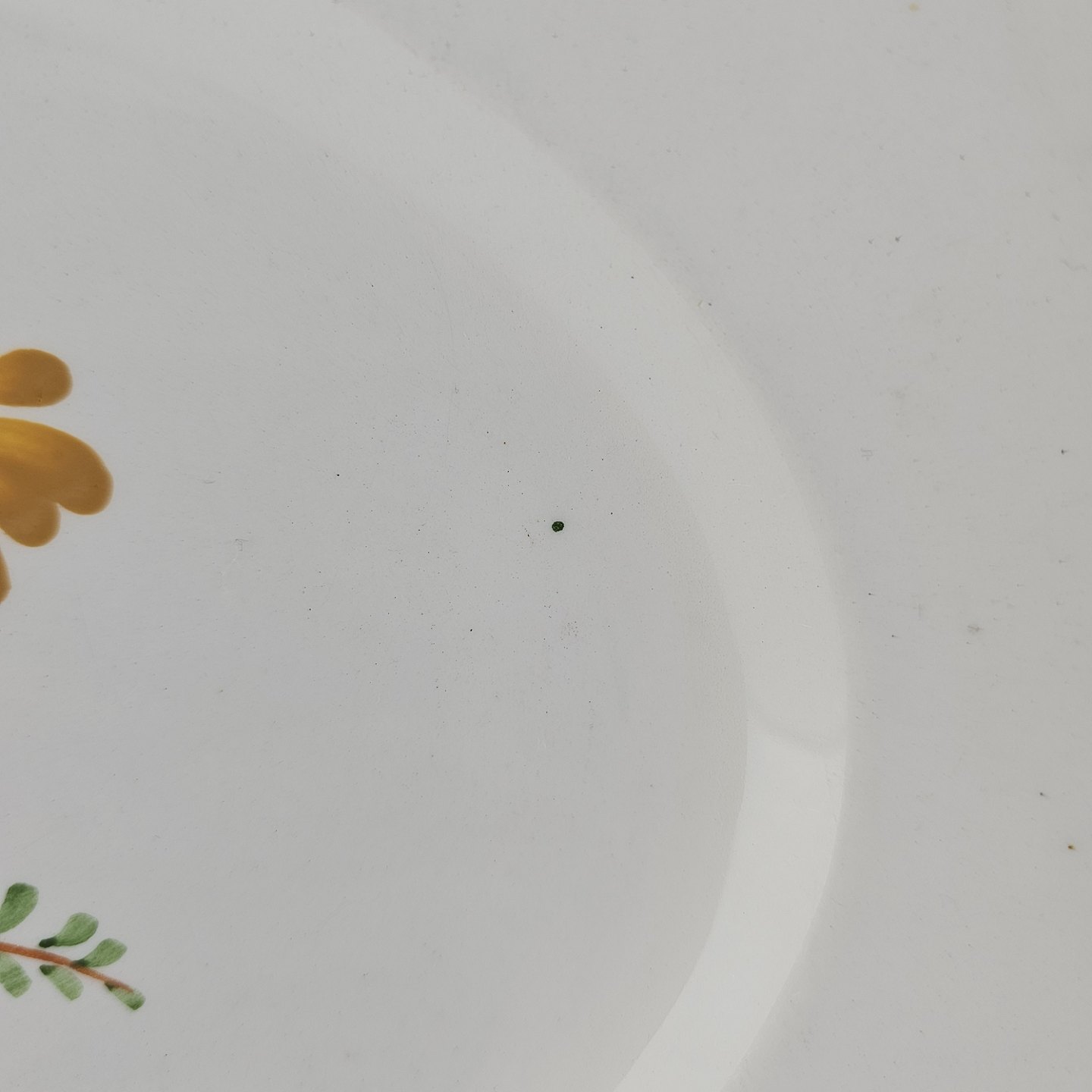 Hvidt fajancestel i stelform Feston/Alma med motiv af gule blomster og grønne blade.