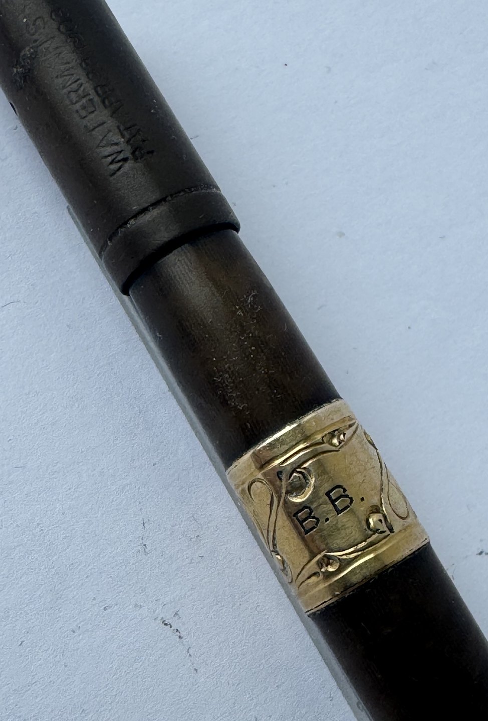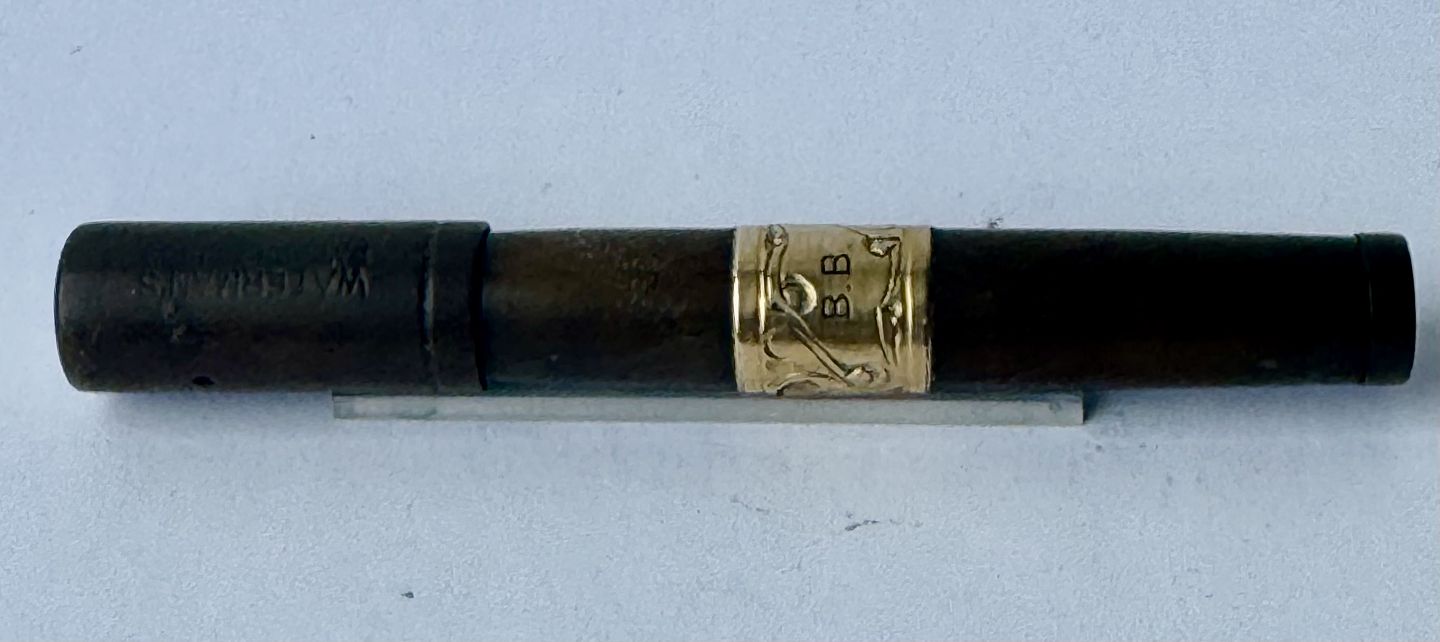 Sort Waterman Safety fyldepen fra 1903. Modelnummer 42 1/2 V er indgraveret på bunden (se foto). Midt på pennen ses et mavebælte i messing dekoreret med en blomst samt ejer initialer B. B. Den originale guldspids kører frem og tilbage når der drejes på bundskruen. Hætten indgraveret WATERMAN’S PAT.APR.28.1903. På bunden, på siden, ses svagt indgraveret WATERMAN samt SAFETY. Fremstår i god stand uden skader eller reparationer. Lidt misfarvning. Længde: 8,7 cm