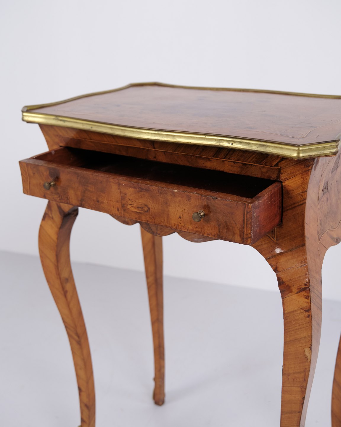 Ein Paar Beistelltische im Neo-Rokoko-Stil aus den 1890er Jahren. Gefertigt aus Rosenholz mit feinen Intarsien, geschwungenen Beinen sowie Details aus Bronze und Messingkante. Die reich verzierte Formensprache und die geschwungenen Linien spiegeln den historischen Stil mit Fokus auf Handwerk und Ornamentik wider.