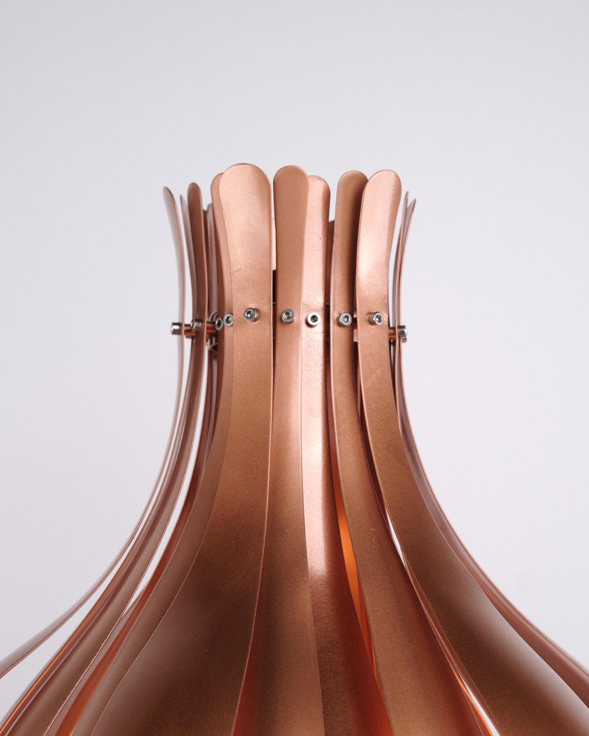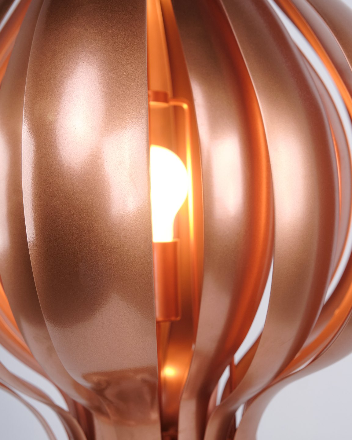 Seltene Onion Tischlampe, entworfen von Verner Panton in den 1970er Jahren. Die Lampe ist aus Kupfer gefertigt und zeichnet sich durch ihre organische, geschichtete Form aus, die einen skulpturalen und dekorativen Ausdruck schafft. Die Konstruktion erzeugt ein weiches und stimmungsvolles Licht, wobei die Reflexionen im Kupfer den Charakter der Lampe hervorheben.
