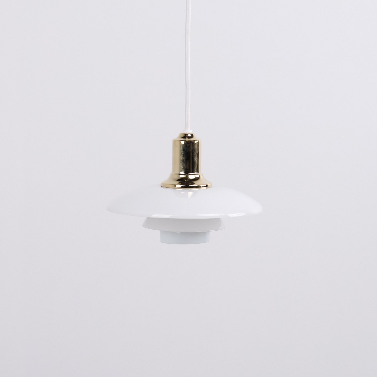 PH 2/1 Pendelleuchte aus Messing mit Opalglas von Louis Poulsen. Entworfen von Poul Henningsen mit klassischem dänischem Lichtdesign und blendfreier Beleuchtung.