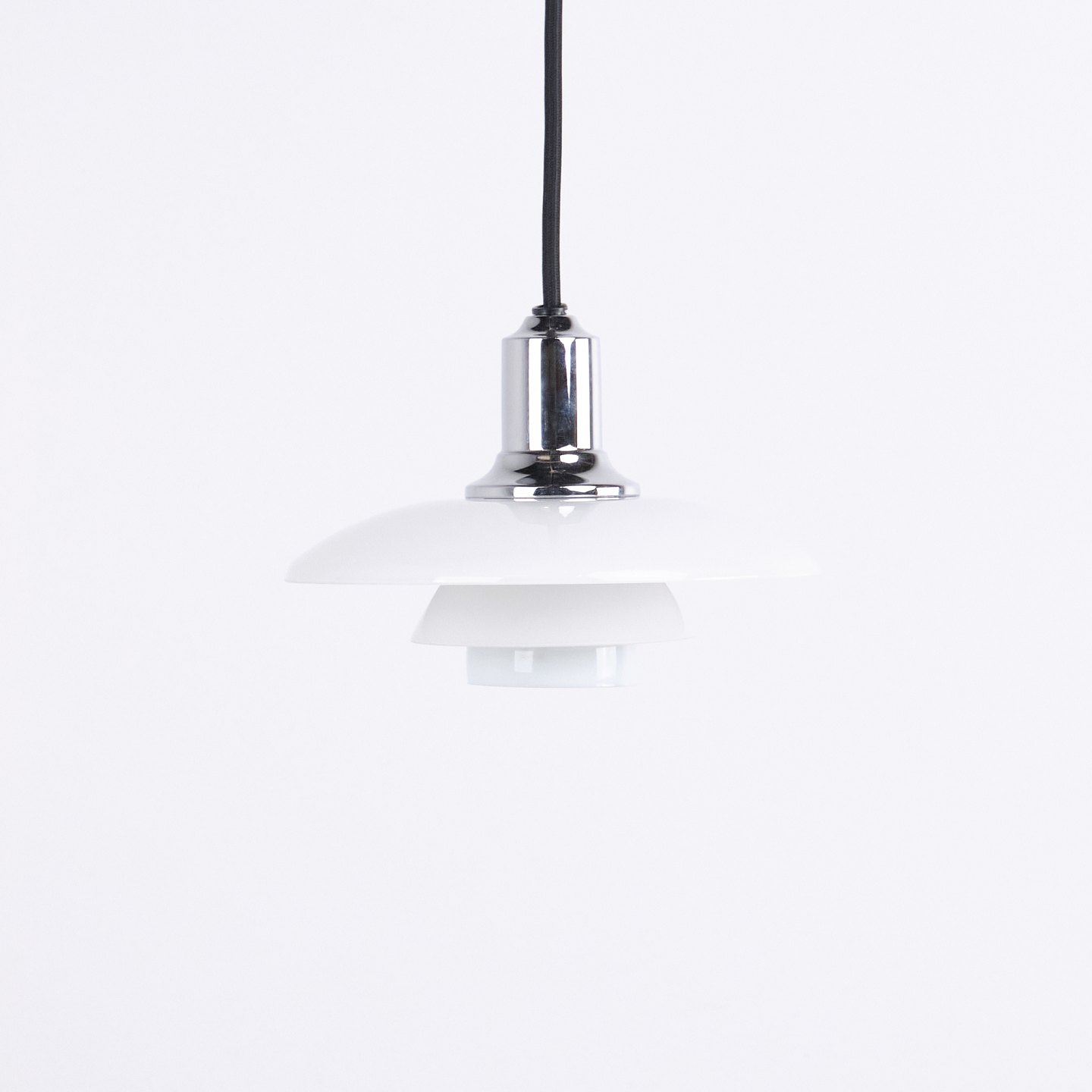 PH 2/1 Pendelleuchte in Chrom mit Opalglas von Louis Poulsen. Entworfen von Poul Henningsen mit klassischem dänischem Lichtdesign und blendfreier Beleuchtung.