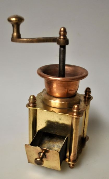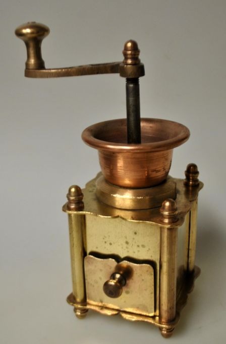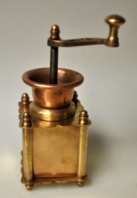 Kleine antike Kaffeemühle aus Messing/Kupfer, 19. Jahrhundert. Dänemark.
