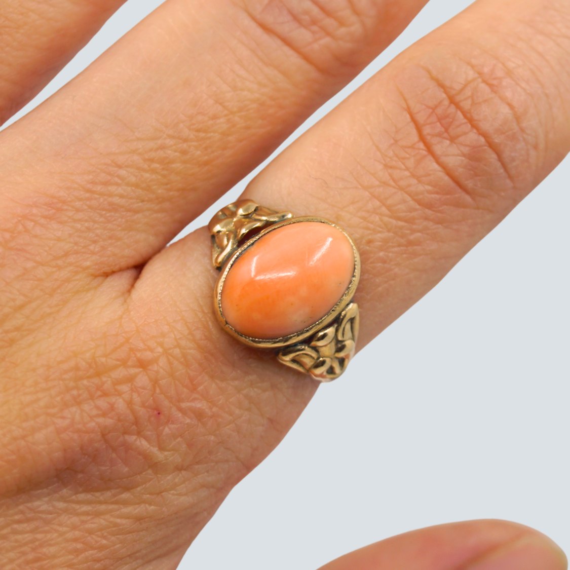 Ring i 14 kt. guld med lys koral.