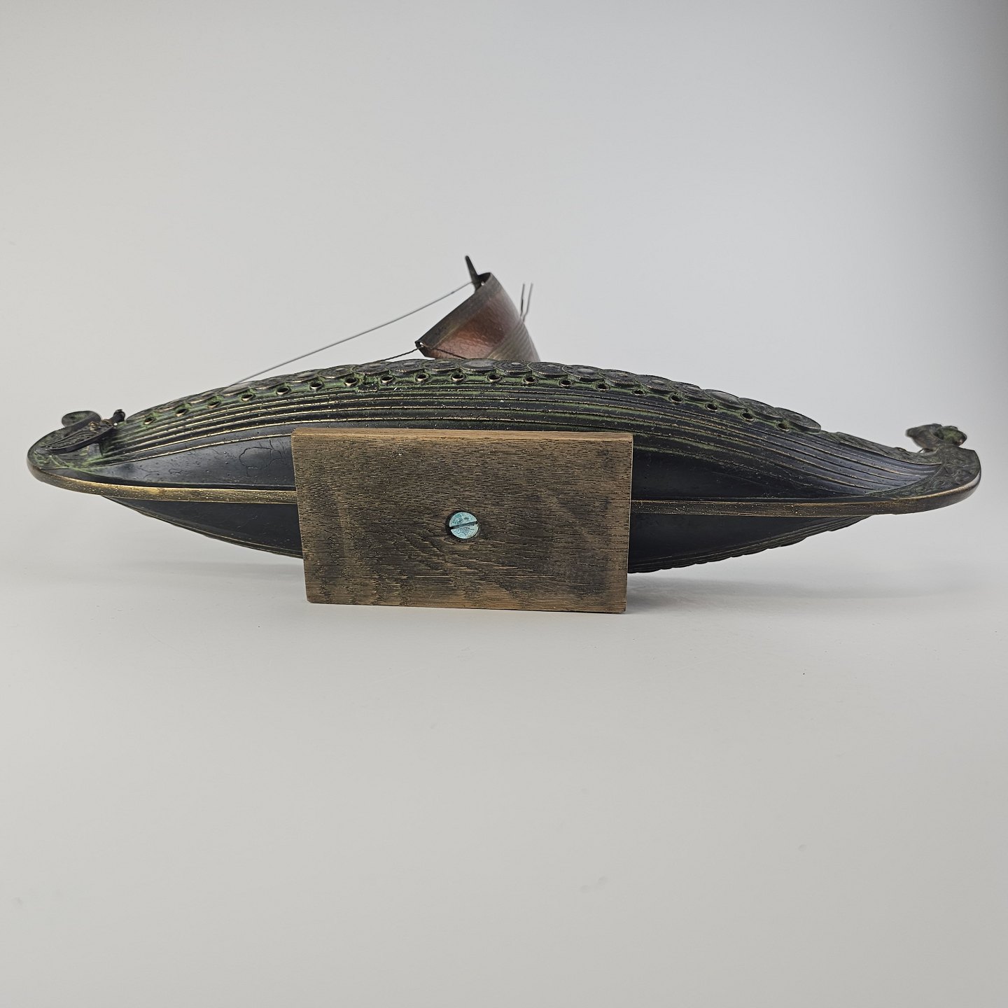 Miniature replika af et dansk vikingeskib lavet i bronze med træfod