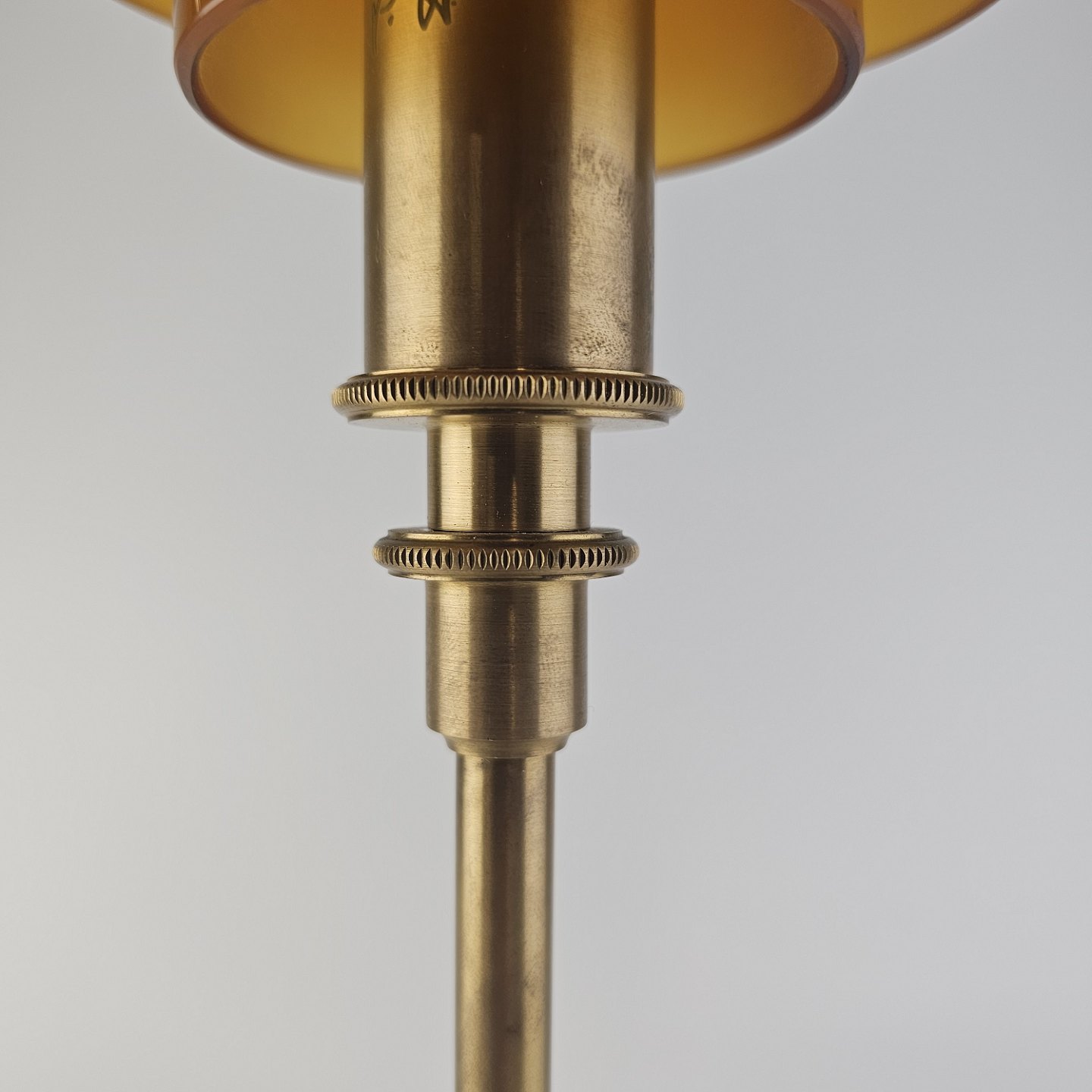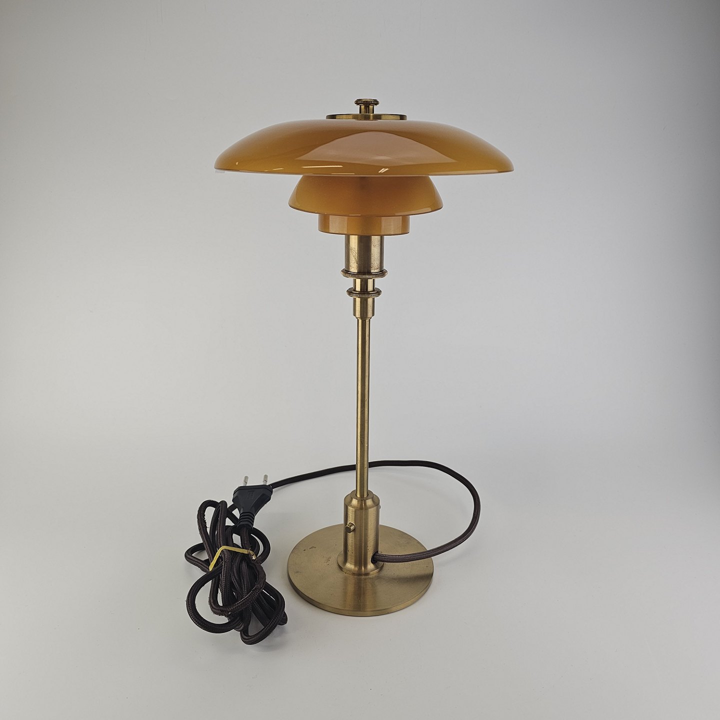 Bordlampe PH 3/2 med skærm af mundblæst ravfarvet etlagsglas og fod af strøgslebet messing