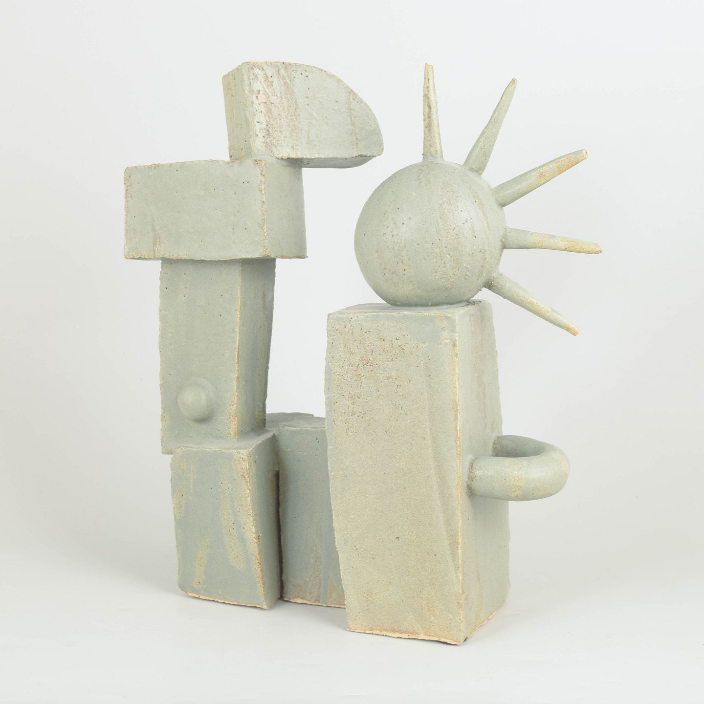 Stor stentøjsskulptur i kubistisk stil, med mat grå glasur overflade.