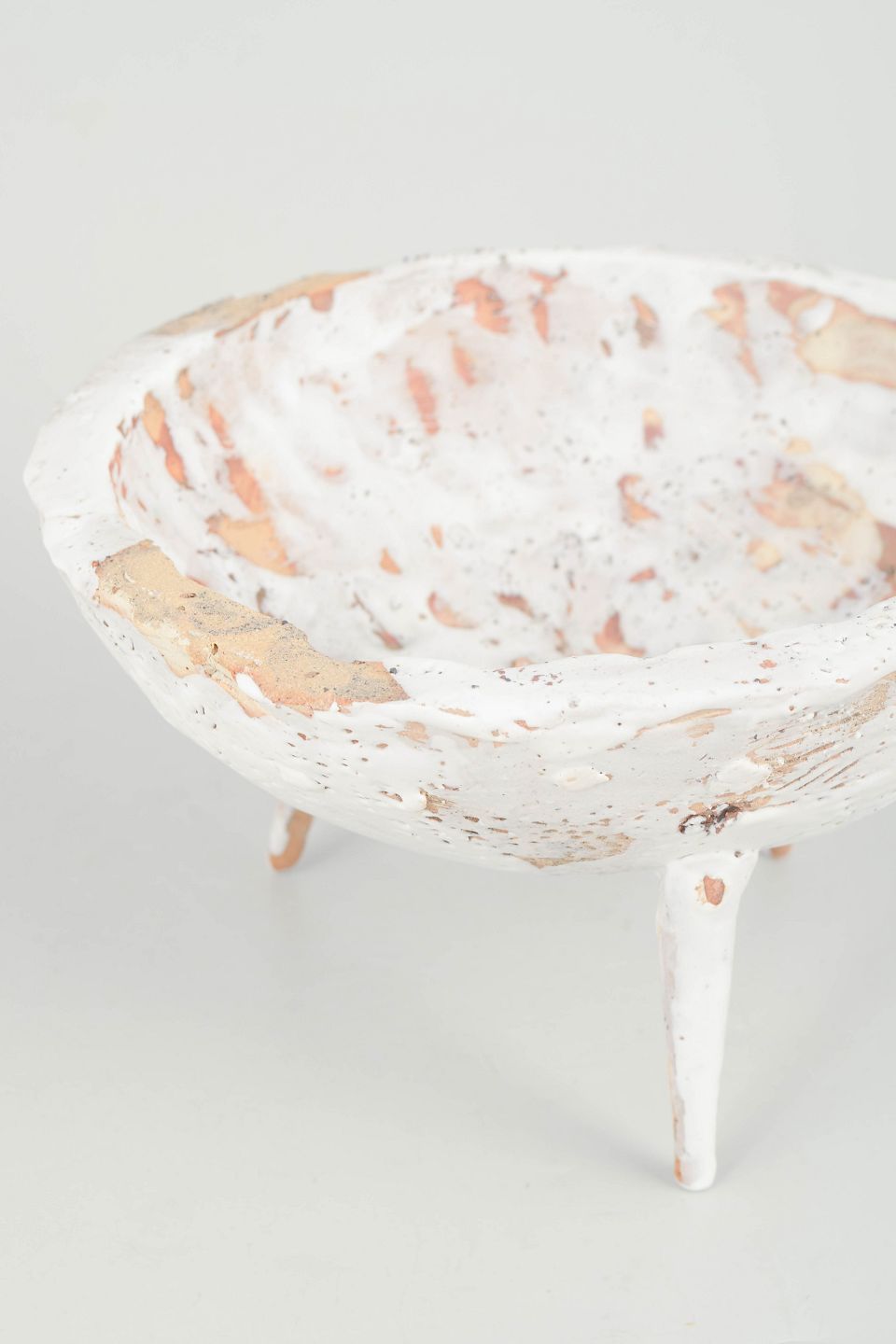 Unika Skål i genbrugt stentøjsler på tre spidse ben. Delvist glaseret fremstår den med det gyldne, brune og hvide områder. De brune områder er ler fra Danmark.