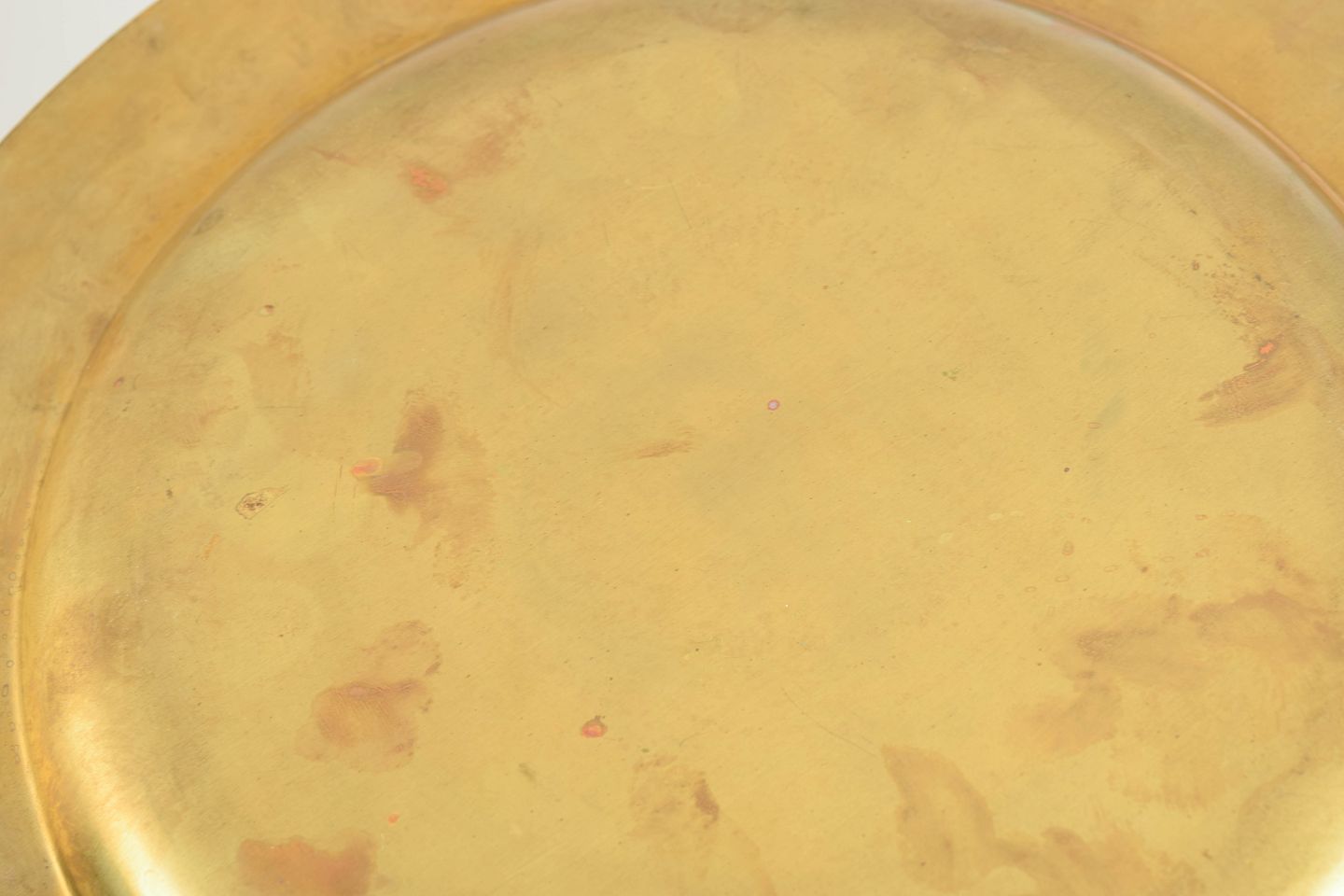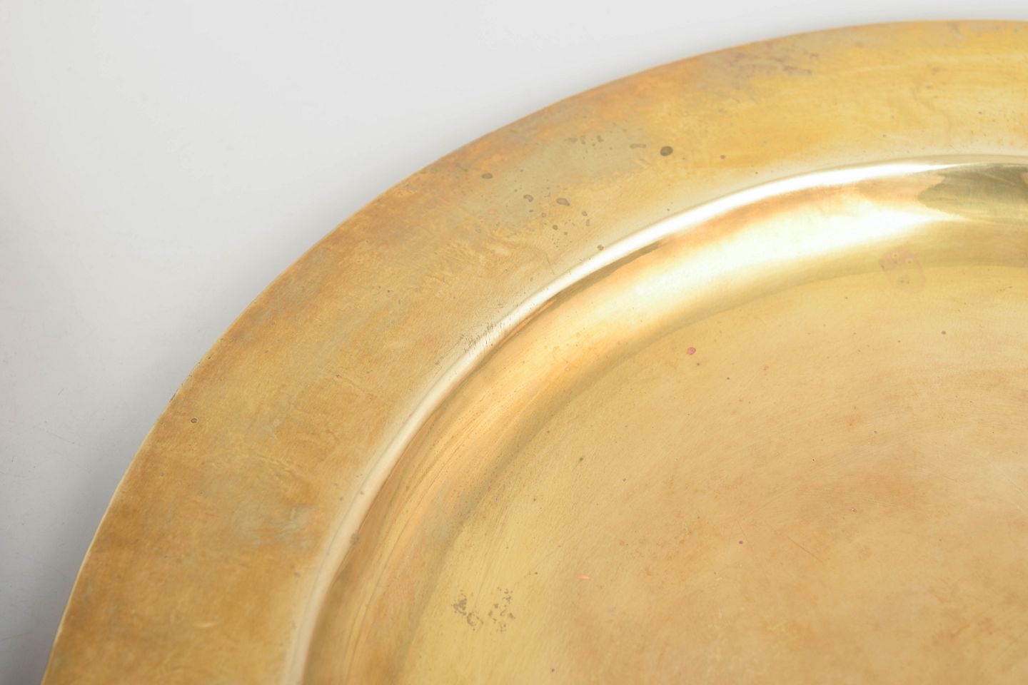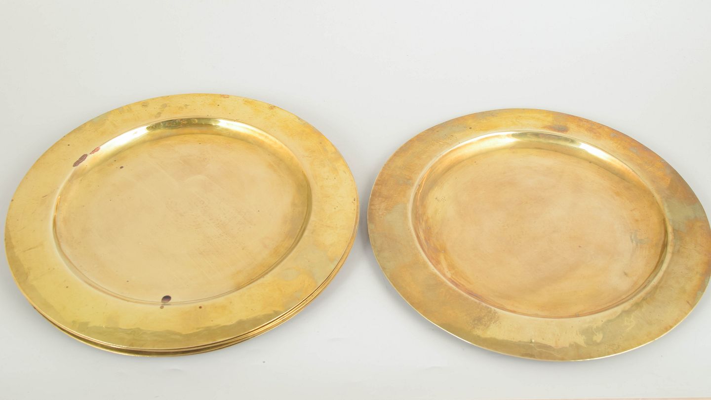 Store runde dækketallerkener udført i poleret messing med bred fane. Klassisk og elegant borddækning fra 1960’erne med varm gylden overflade.