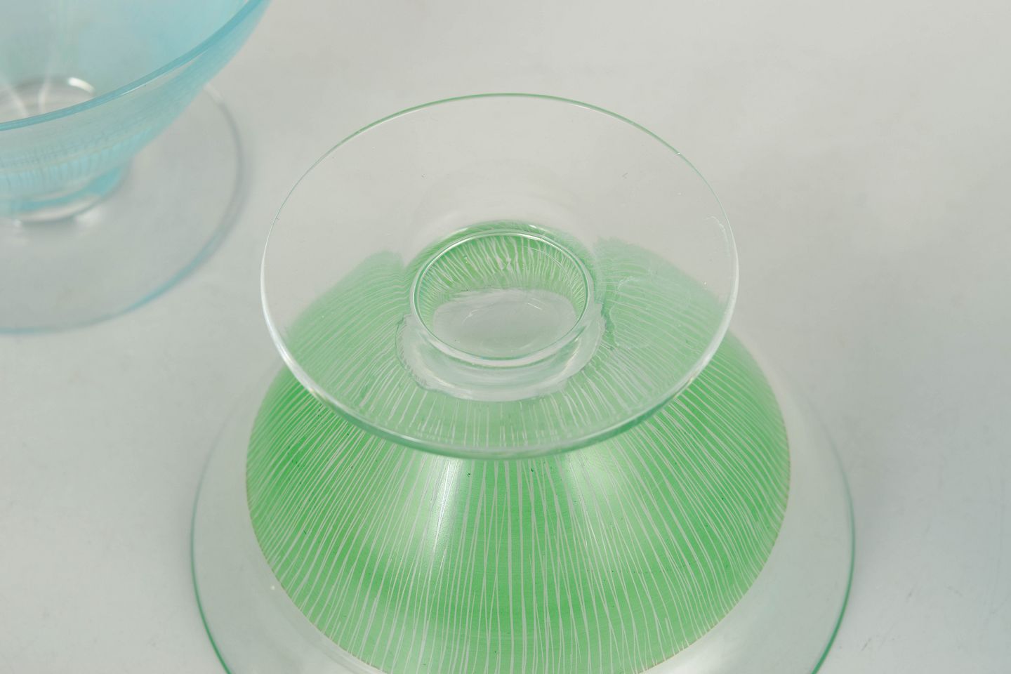 Elegante glas i klart glas med fine indfarvede ribbede strukturer i blå og grønne nuancer. Lette og dekorative former fra 1960’erne, velegnede som både cocktailglas og dessertskåle.