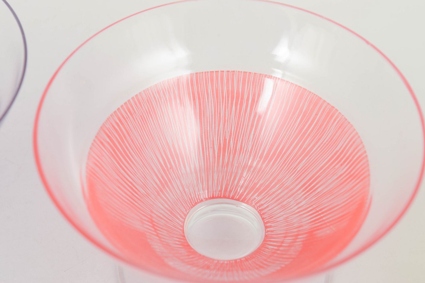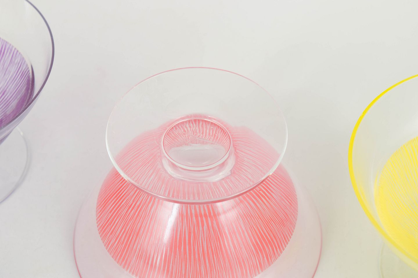 Elegante glas i klart glas med fine indfarvede ribbede strukturer i lilla, rosa og gul. Lette og dekorative former fra 1960’erne, velegnede som både cocktailglas og dessertskåle.