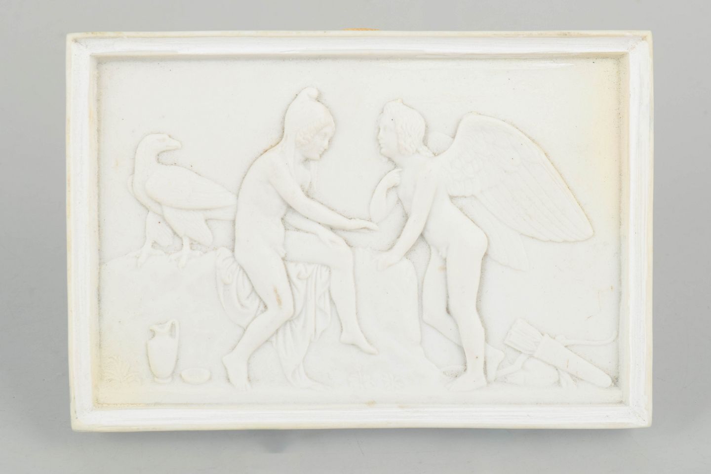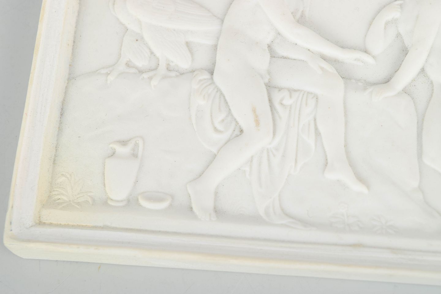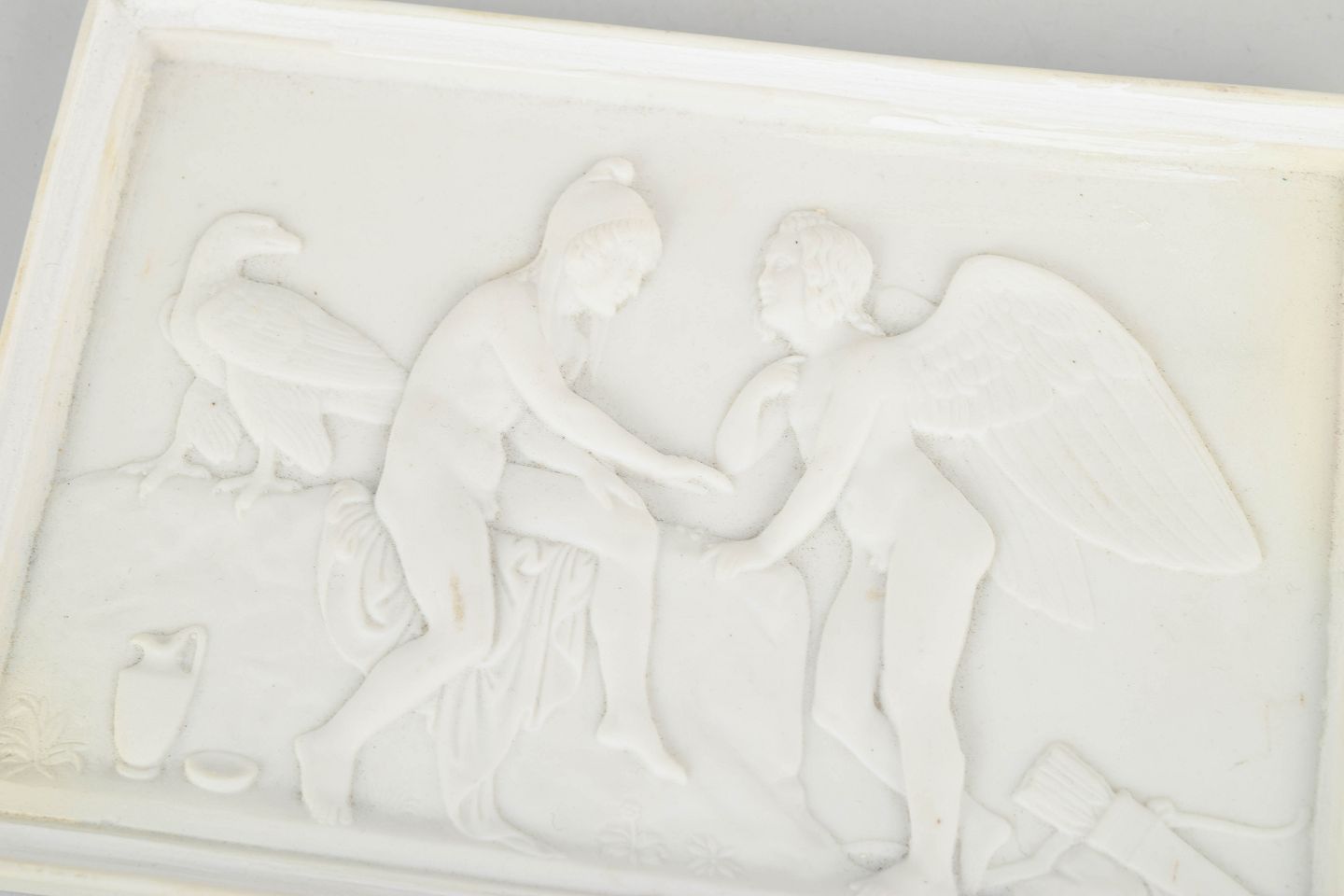 Rektangulært vægrelief i hvidt bisquitporcelæn med klassicistisk motiv af putti og figurkomposition efter Bertel Thorvaldsen, udført med fine detaljer og blød modellering i nyklassicistisk stil.