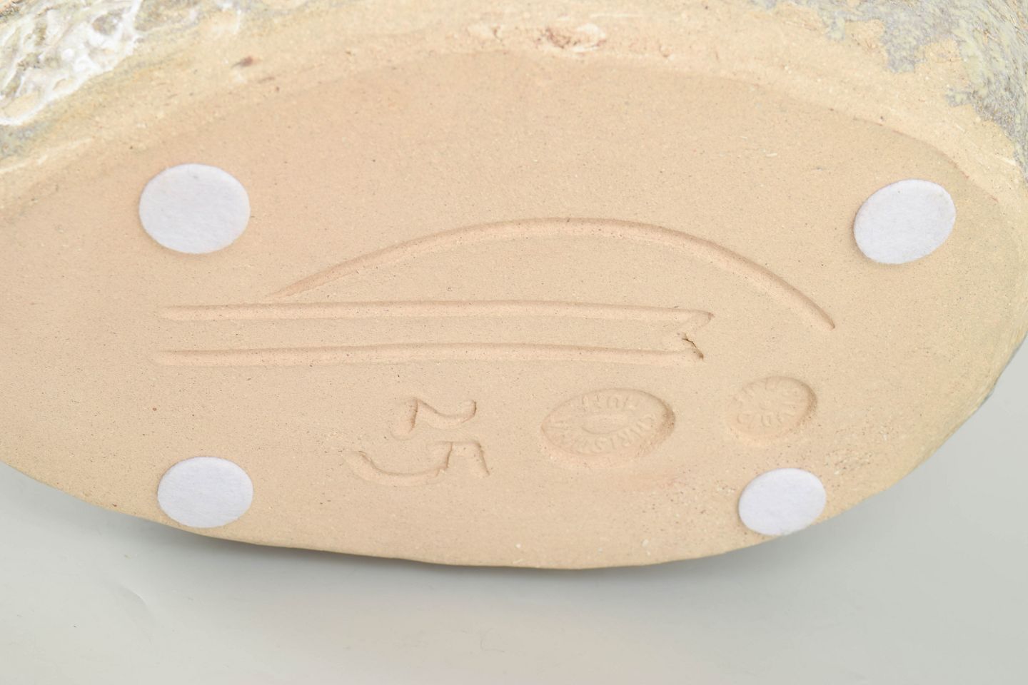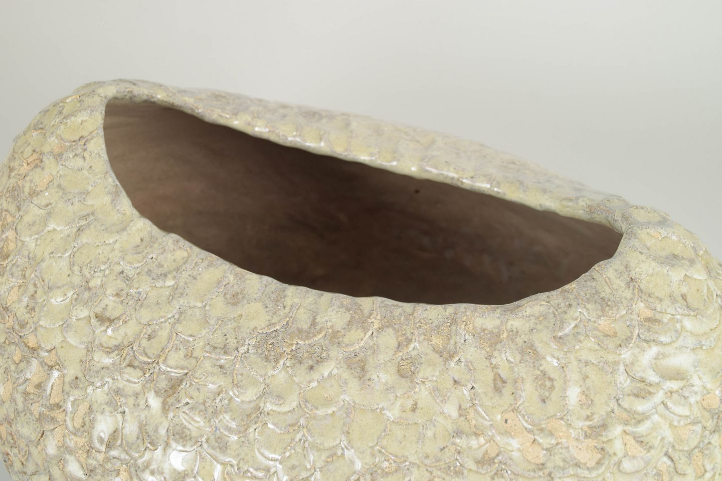 Stor unika rund stentøjsvase. Værket er uglaseret i kunstnerens signaturstil med blandede lertyper af genbrugsler. Leret er sammensat med tusindvis af små tryk med fingrene, dette giver værket et taktilt, organisk og blødt udtryk.
