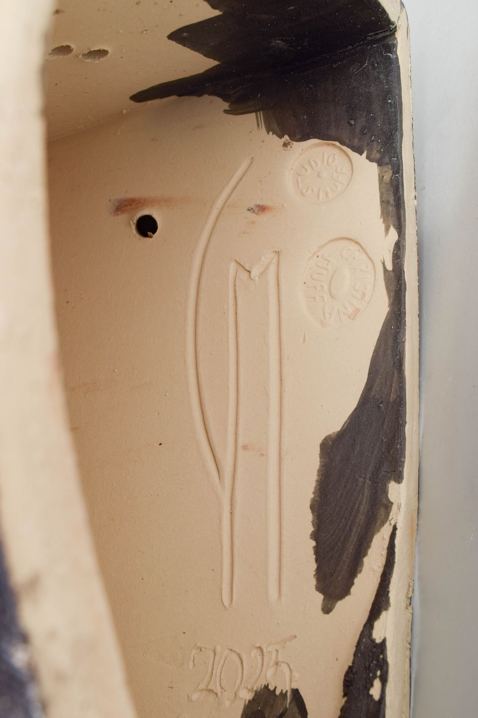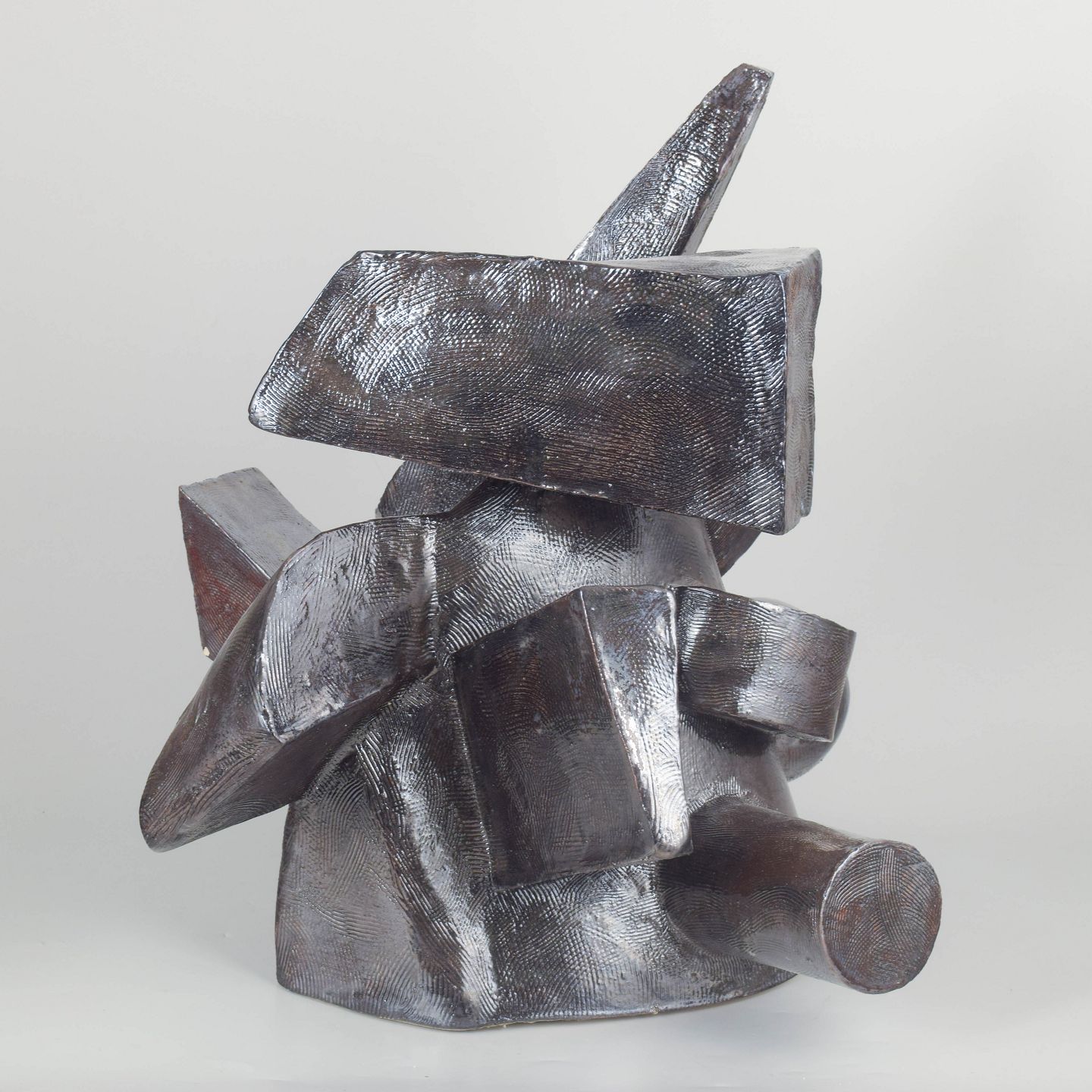 Monumentalt stor skulptur i kubistisk stil, med glat, næsten metallisk overflade. Mørkegrå, næsten sort glasur med brune områder.