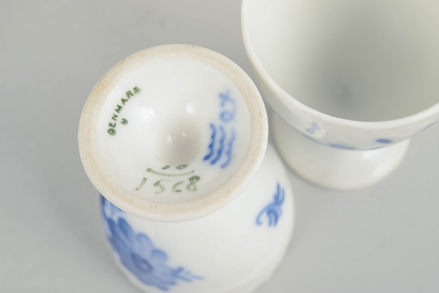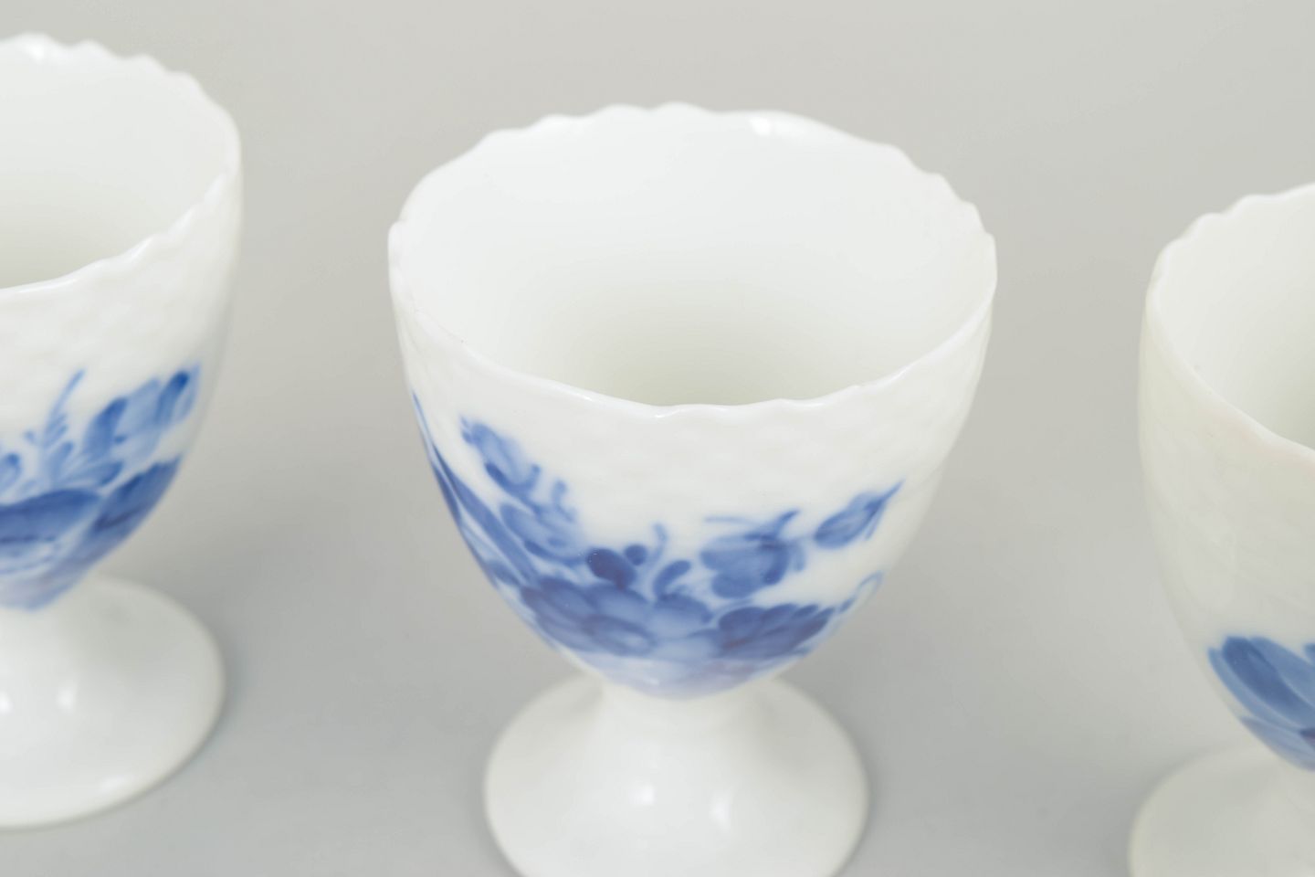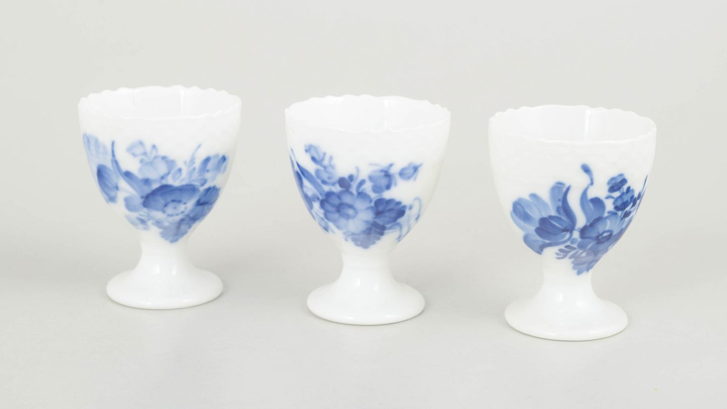 Sæt bestående af tre æggebægre i porcelæn med håndmalet blå blomsterdekoration i relief. Modelnummer 10/1568, 1. sortering, fra tidligt 1900-tal.