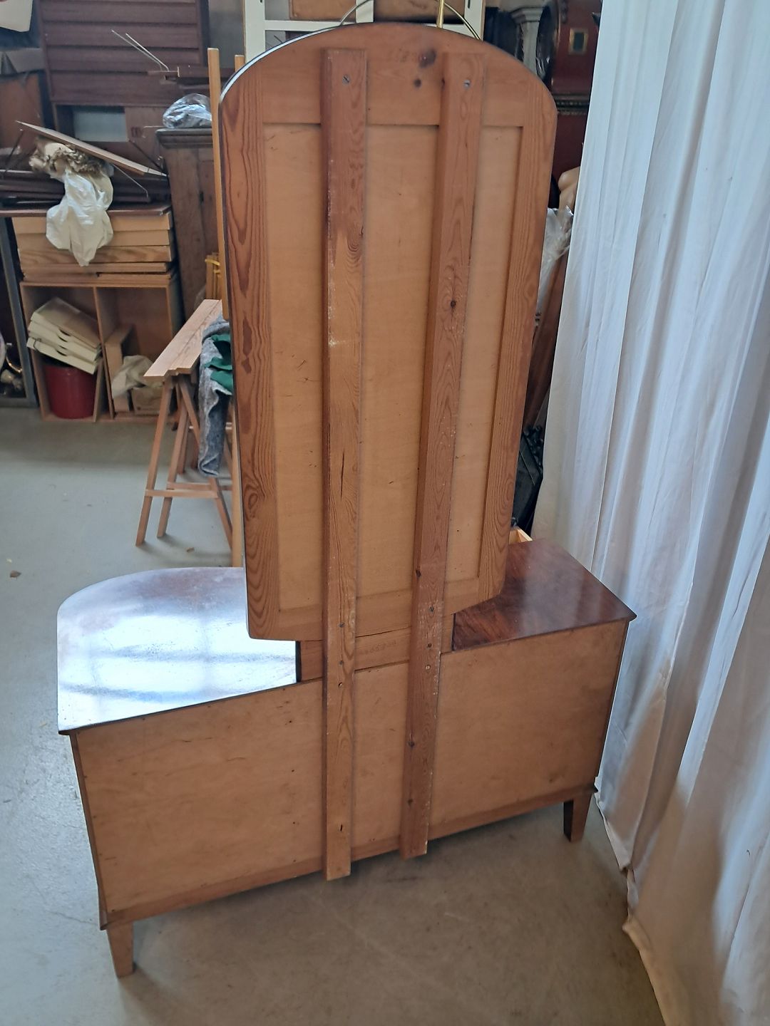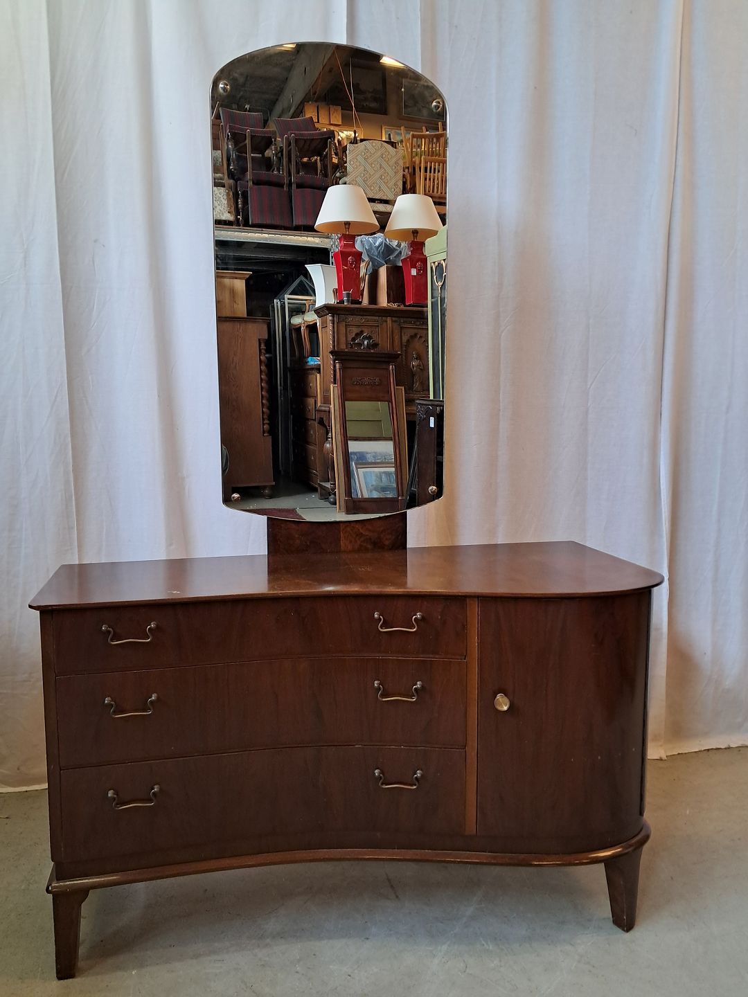 Skuffemøbel med spejl i fineret nødetræ, fra 1950erne.