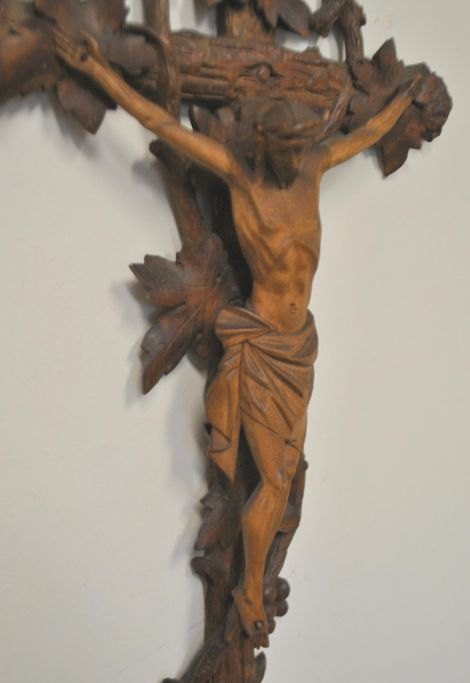 Geschnitztes Holzkreuz, Deutschland, 19. Jahrhundert. Das Kreuz ist mit Weinreben, Trauben und Rinde verziert. Höhe: 48 cm, Breite: 22 cm.