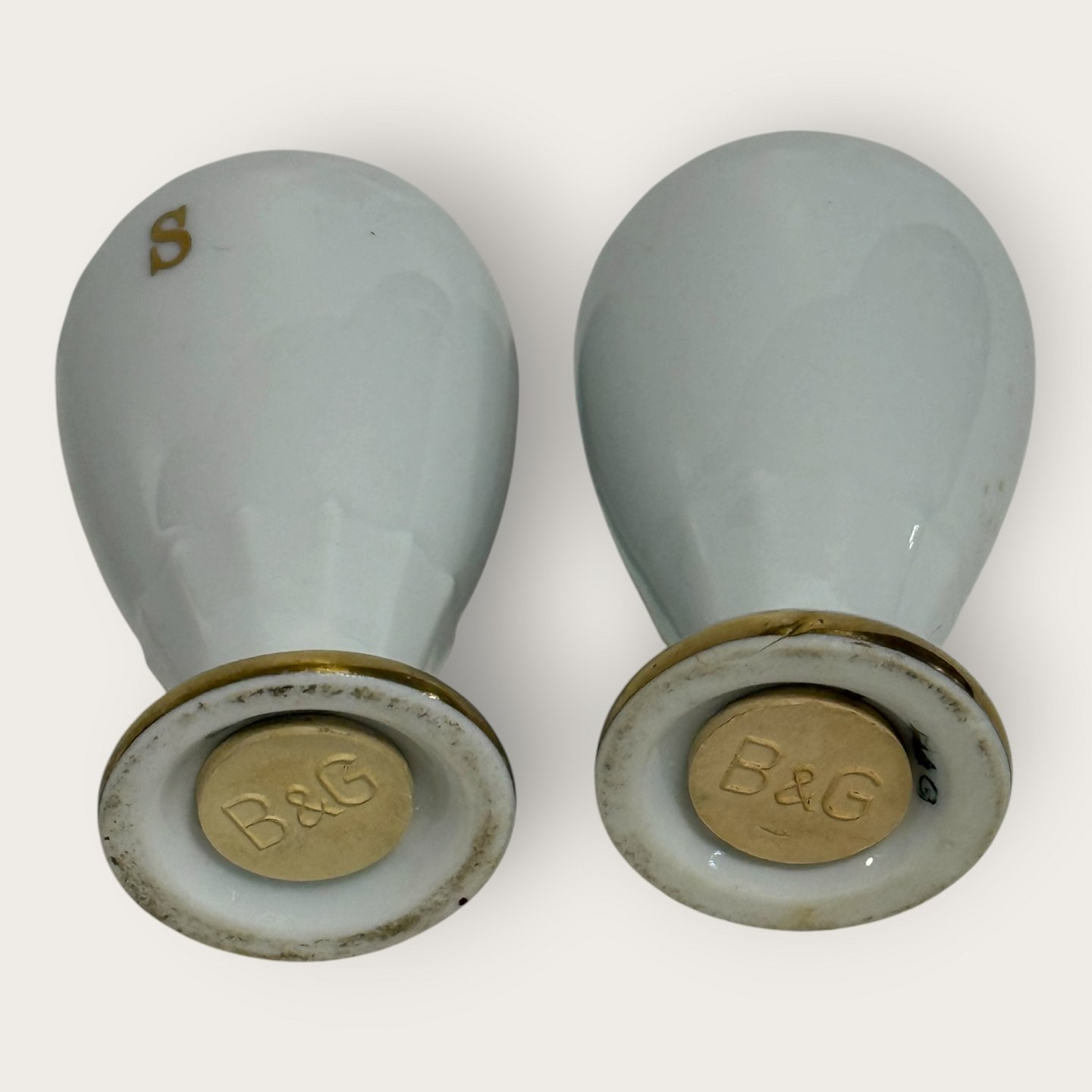 | Bing & Grondahl, Aakjær, Weißes Porzellan mit Goldrand, Salz- und Pfefferstreuer, 7 cm hoch, 1. Wahl *Guter Zustand*