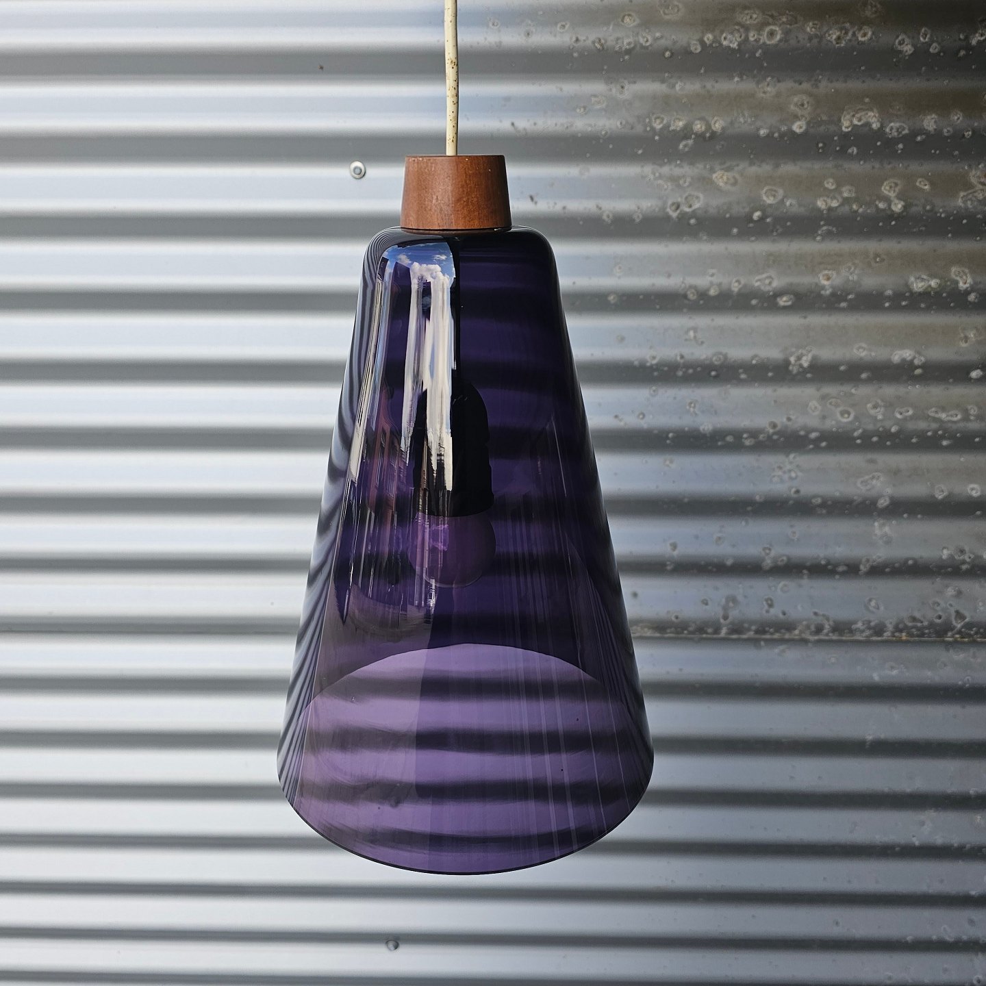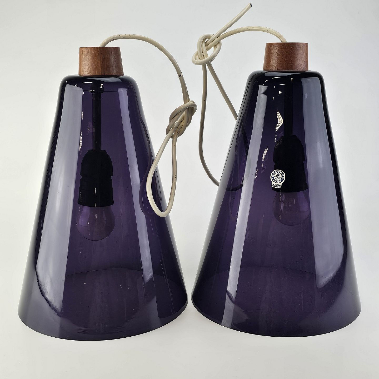 Sæt af to pendler i lilla glas med montering i teaktræ