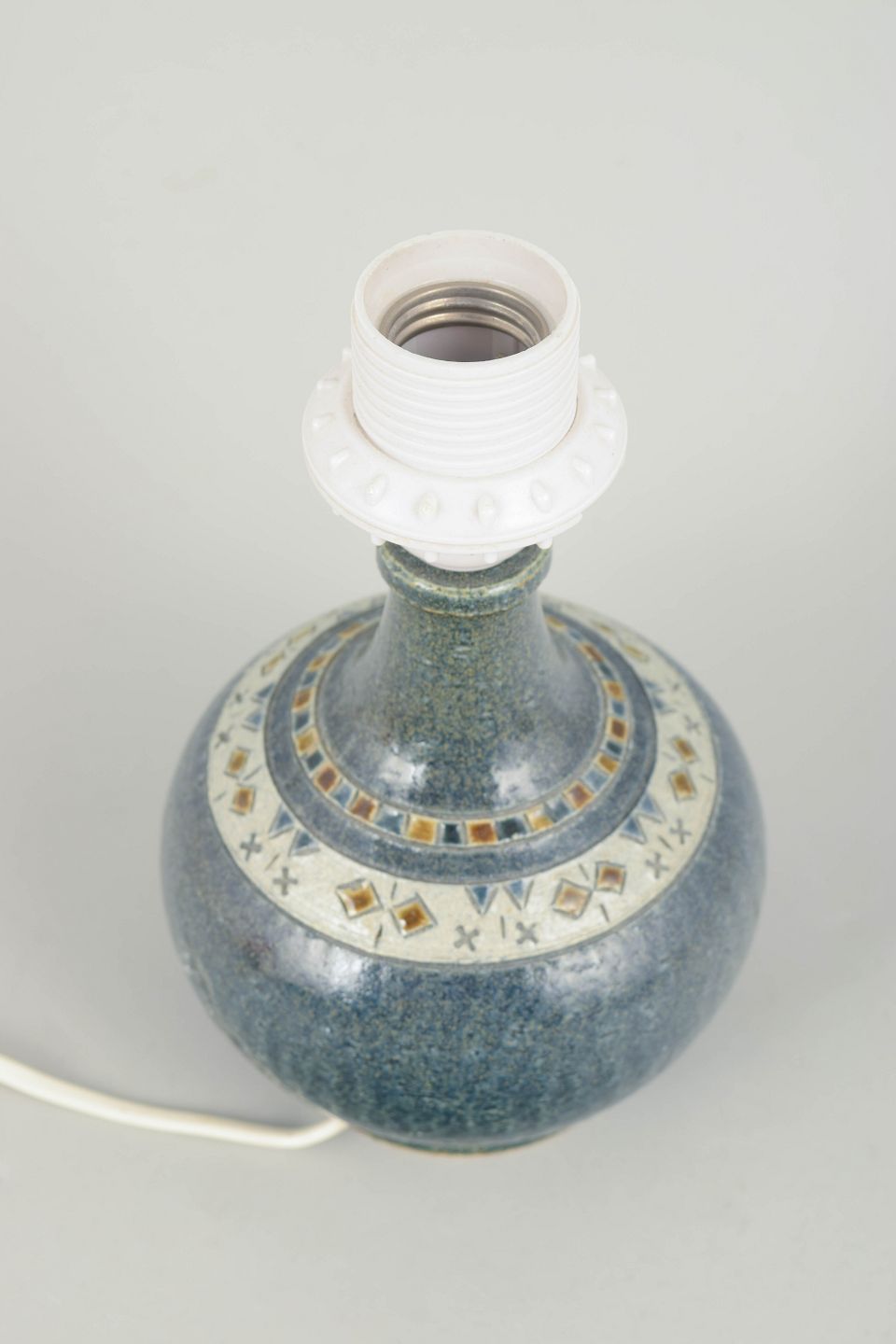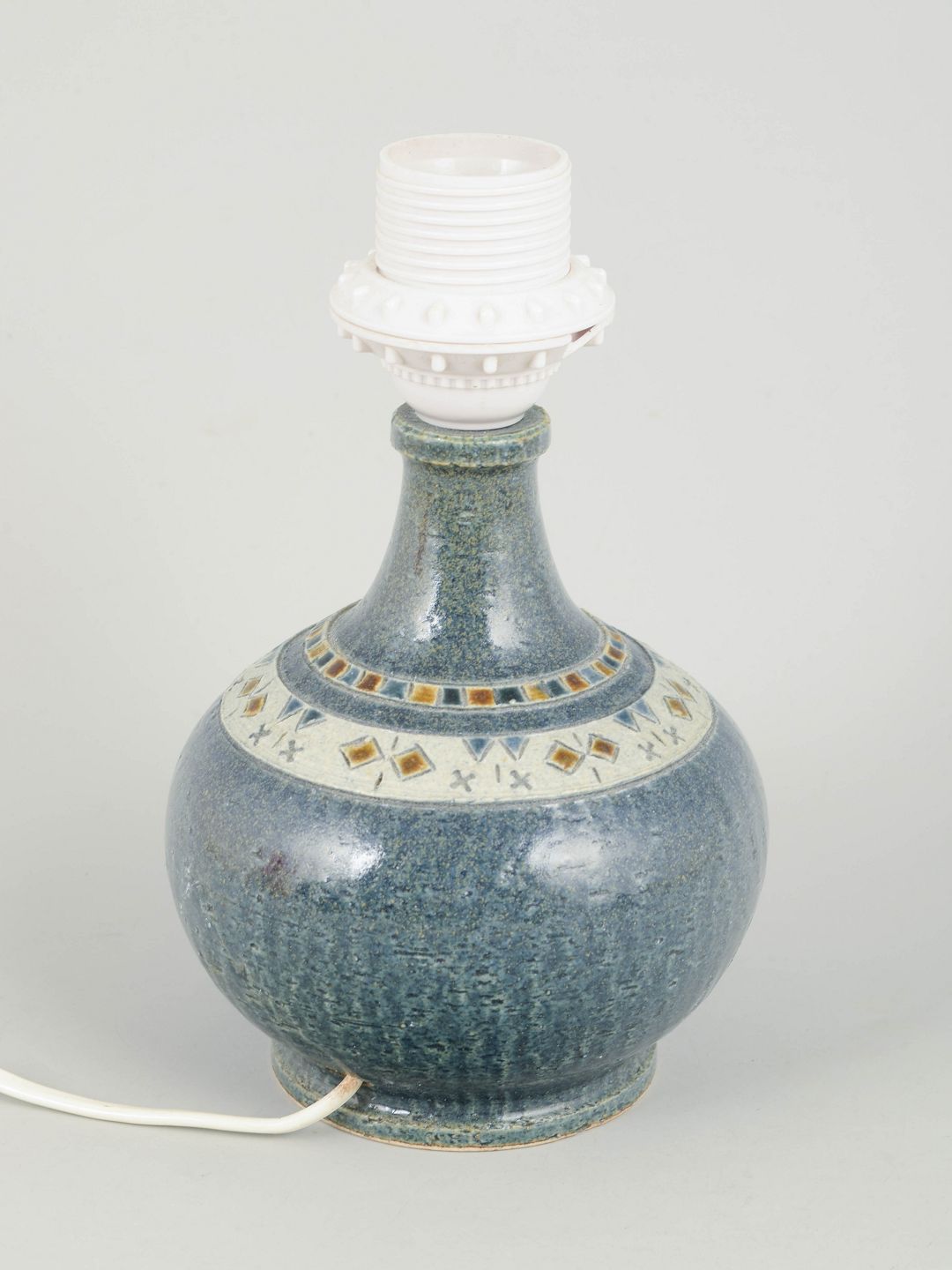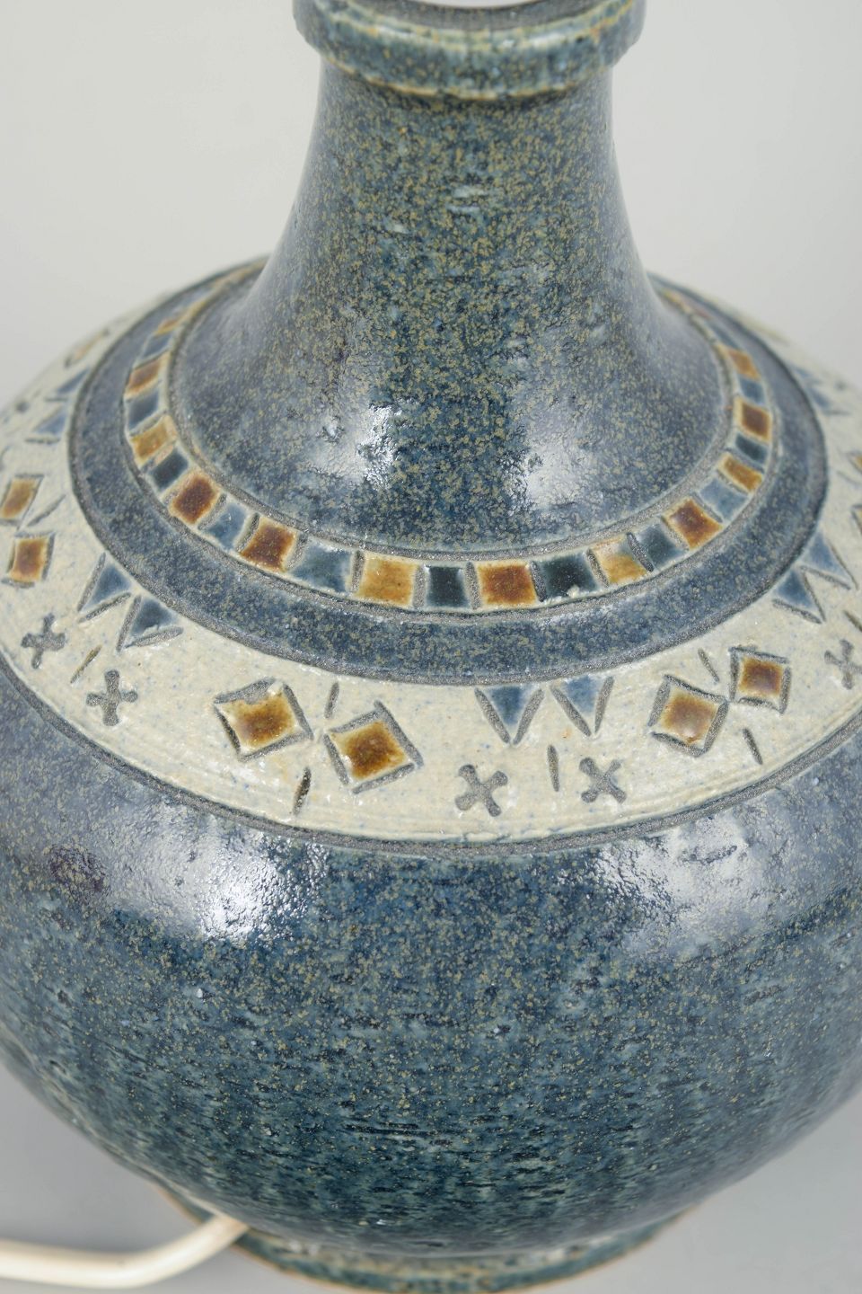 Dekorativ bordlampe i stentøj med karakteristisk reliefmønster og grøn glasur, monteret med lys fatning. Kort ledning uden stik.