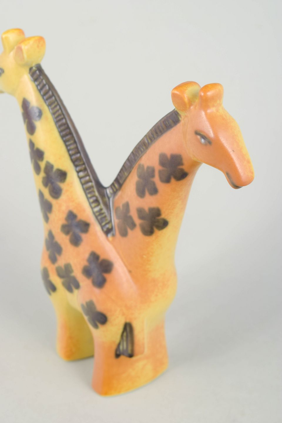 Stiliseret figur i stentøj med to sammenvoksede giraffer, dekoreret med håndmalede blomster og varme gule og orange glasurtoner. Formgivningen er karakteristisk for Lisa Larssons legende og organiske formsprog fra serien “Afrika”.