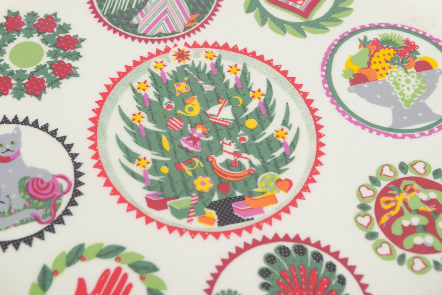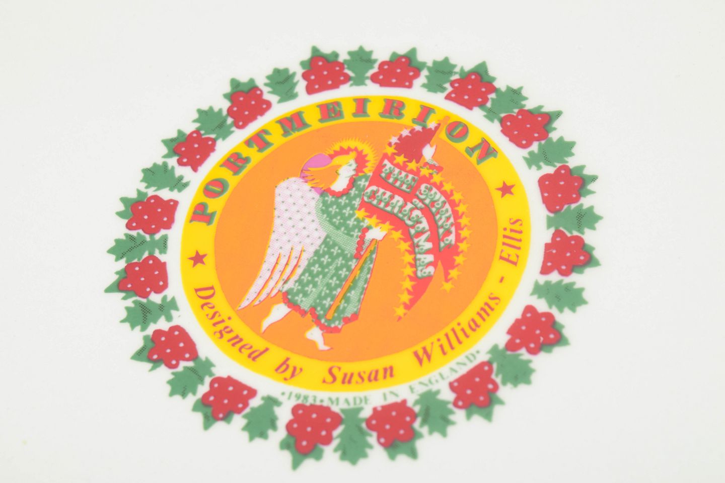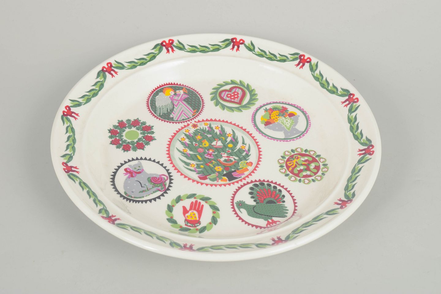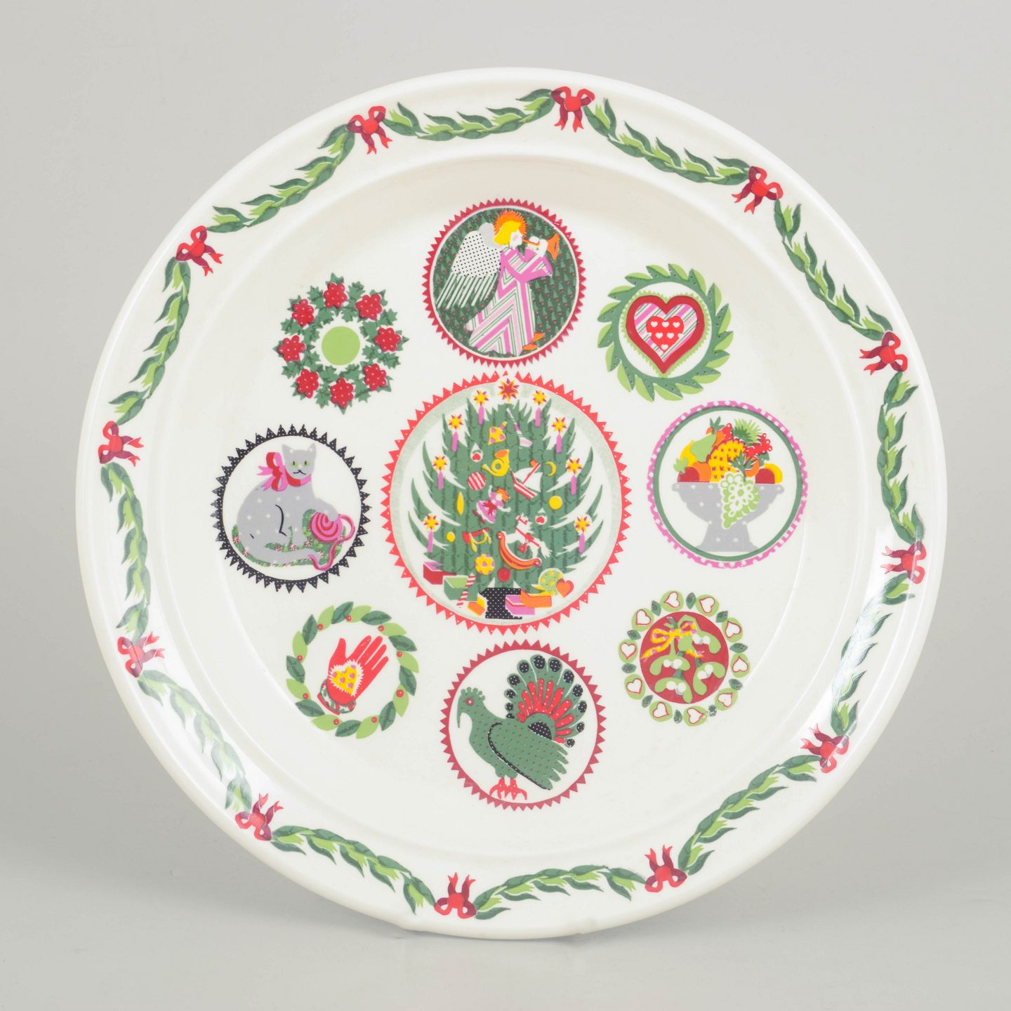 Dekorativt porcelænsfad med flerfarvet motiv bestående af stiliserede figurer og ornamentale elementer arrangeret i cirkulære felter. Rigt dekoreret kant med grøn guirlande og røde sløjfer. Fremstår som et karakteristisk eksempel på britisk design fra 1980’erne.