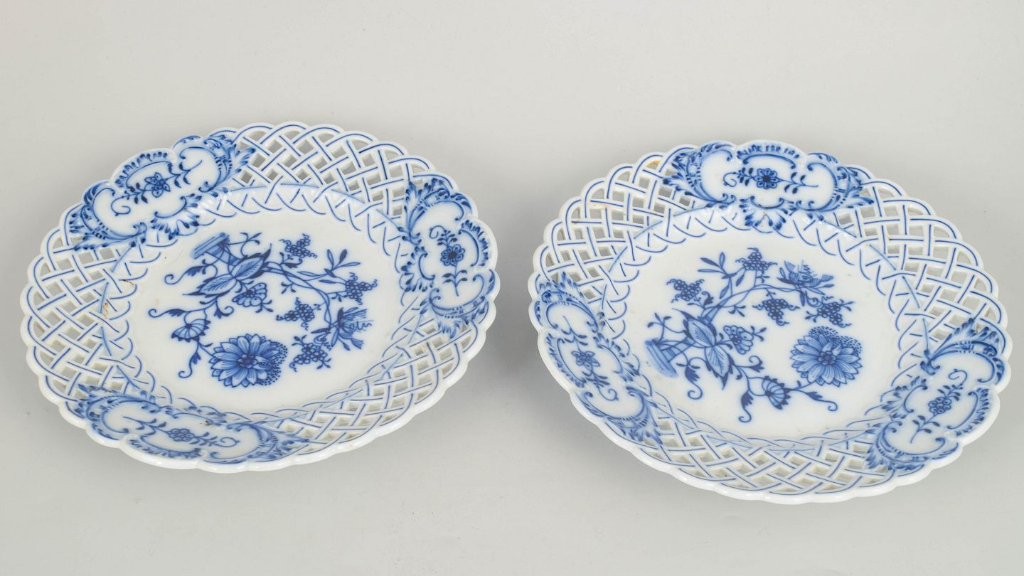 Klassiske middagstallerkener i porcelæn med gennembrudt fane og blå løgmønstret dekoration i underglasur. Elegant håndmalet udtryk med fin detaljering.
