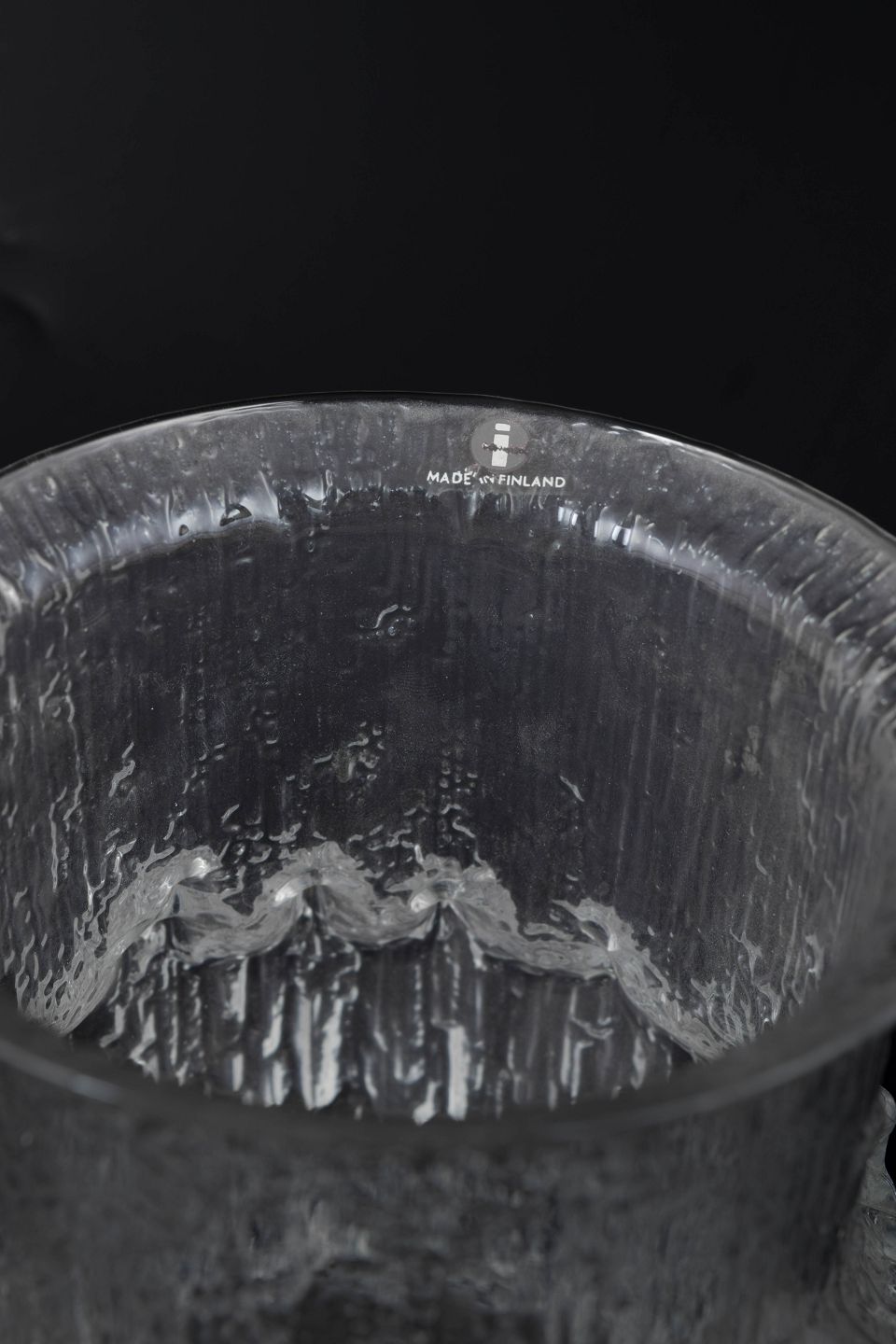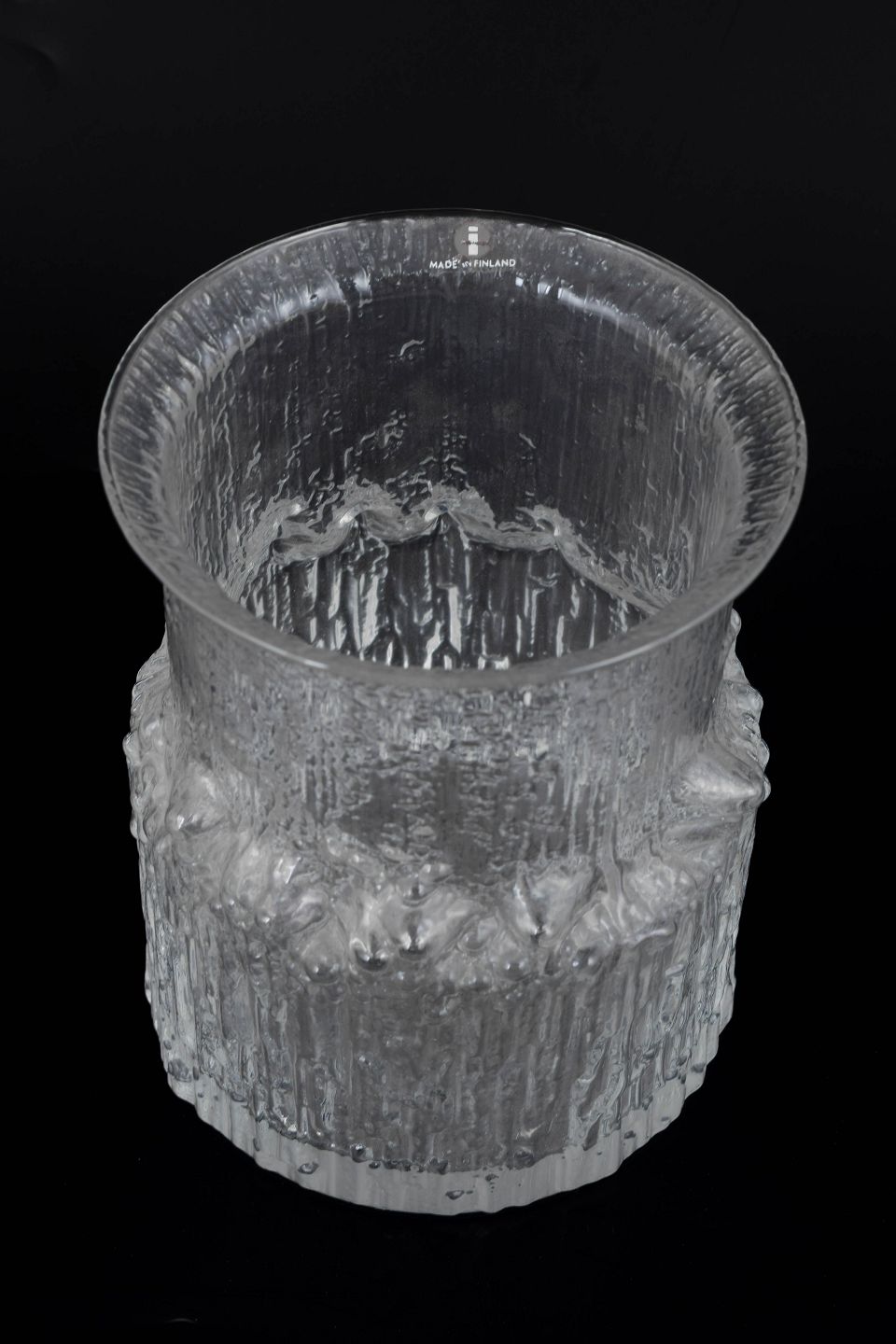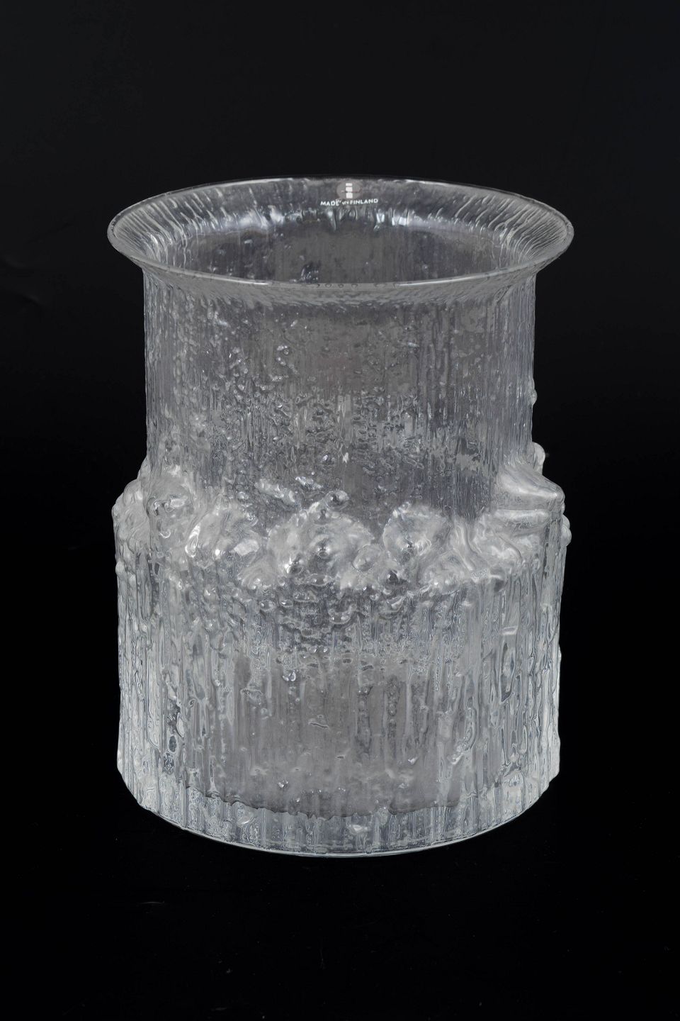 Klar glasvase med karakteristisk isstruktureret overflade og reliefdekor, der minder om smeltende is. Cylindrisk form med let udadbøjet kant. Fabriksmærkat bevaret.