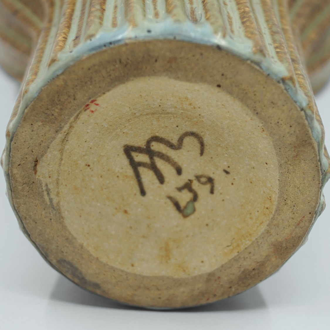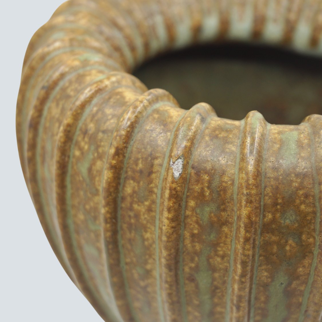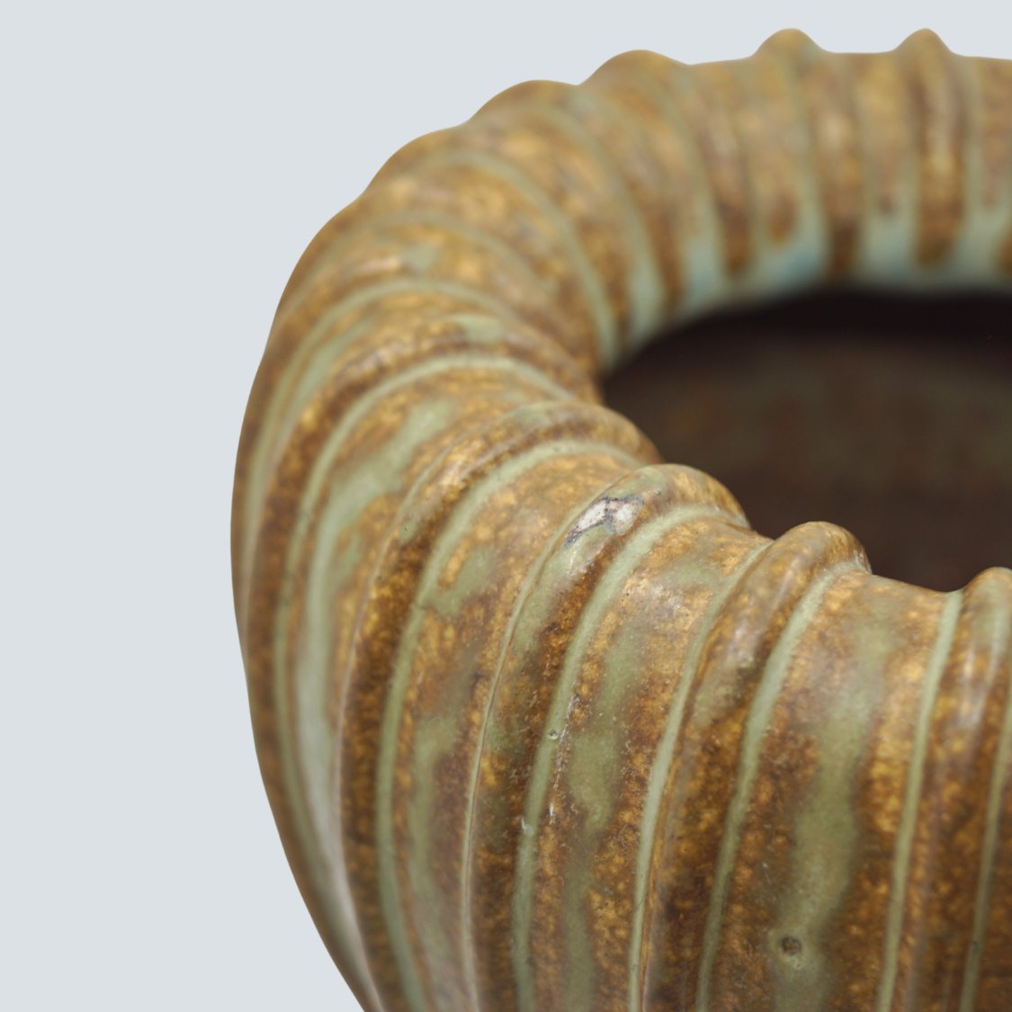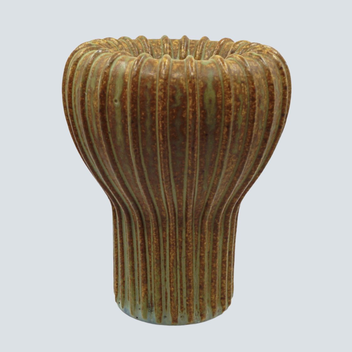 Text zugänglich auf Dänische: Arne Bang; Riflet vase af stentøj, nr. 139 Dekoreret med grønblå og brun glasur.