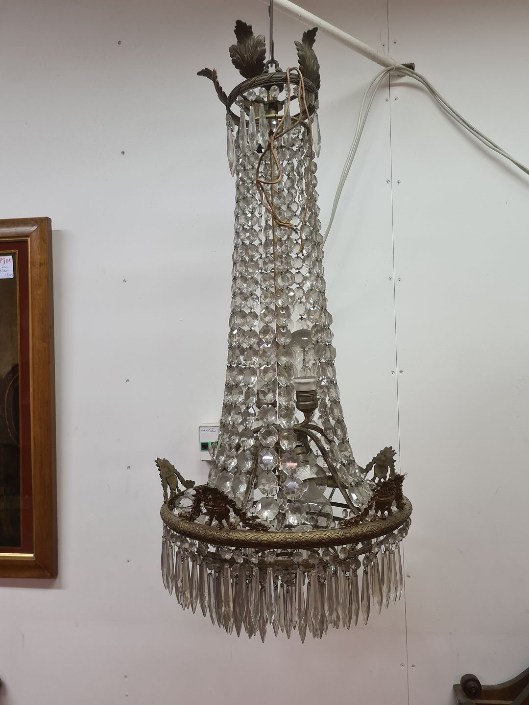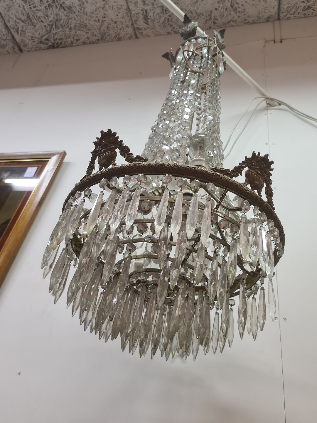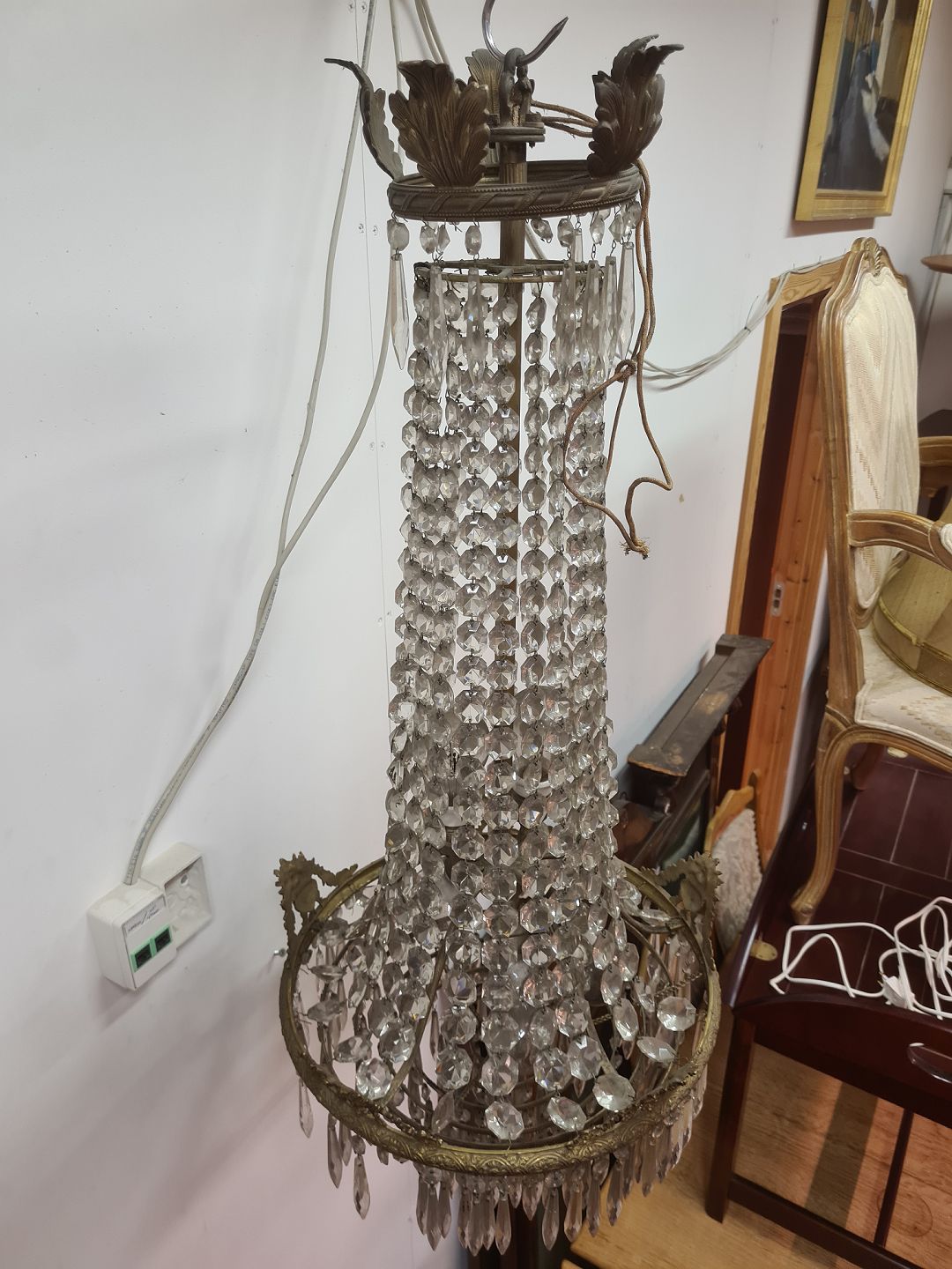 Prismelysekrone fra 1930'erne. Fremstår med få brugsspor og enkelte manglende prismer. Udstyret med stofledninger der nok bør udskiftes inden ibrugtagning.