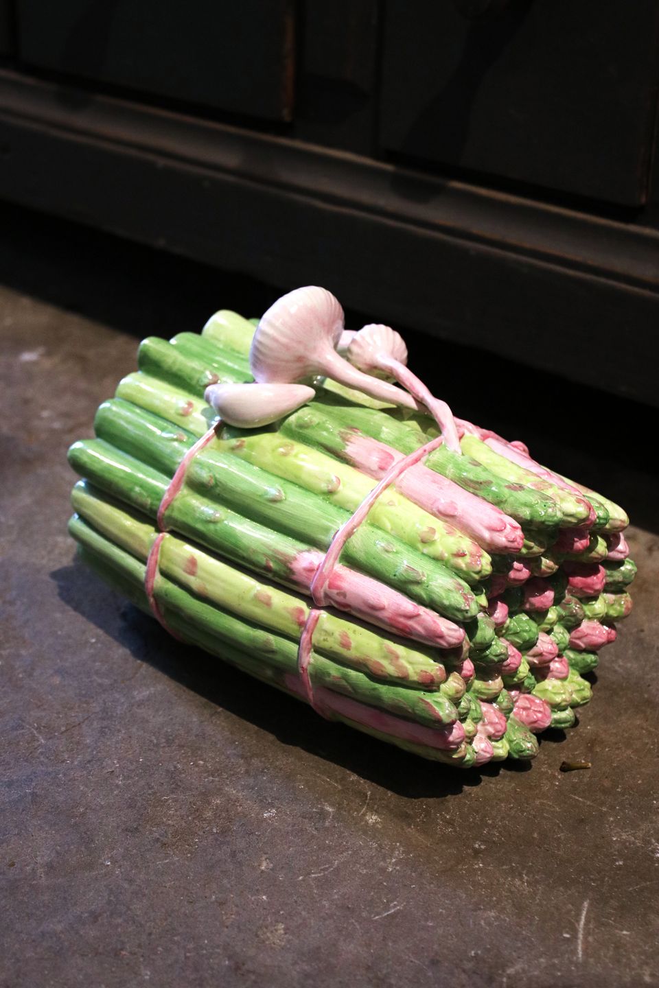 Gammel , italiensk fajance låg krukke i form af et bundt asparges med hvidløg på toppen. H:18cm. L: 24cm. B: 16,5cm.