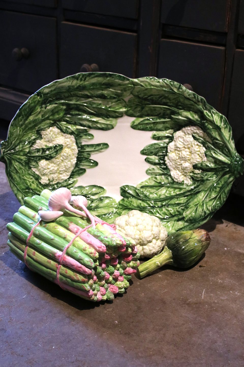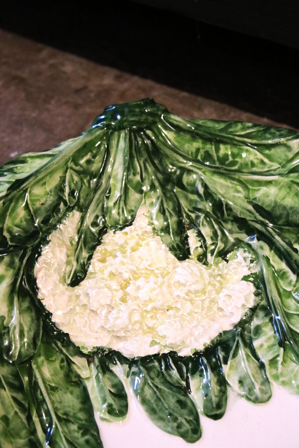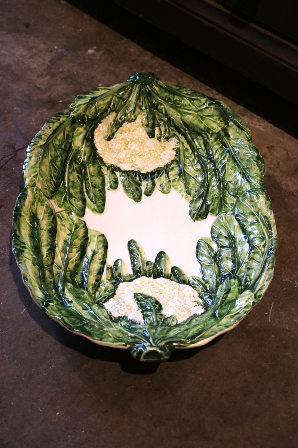 Gammelt italiensk fajance fad med salatblade og blomkåls dekorationer.