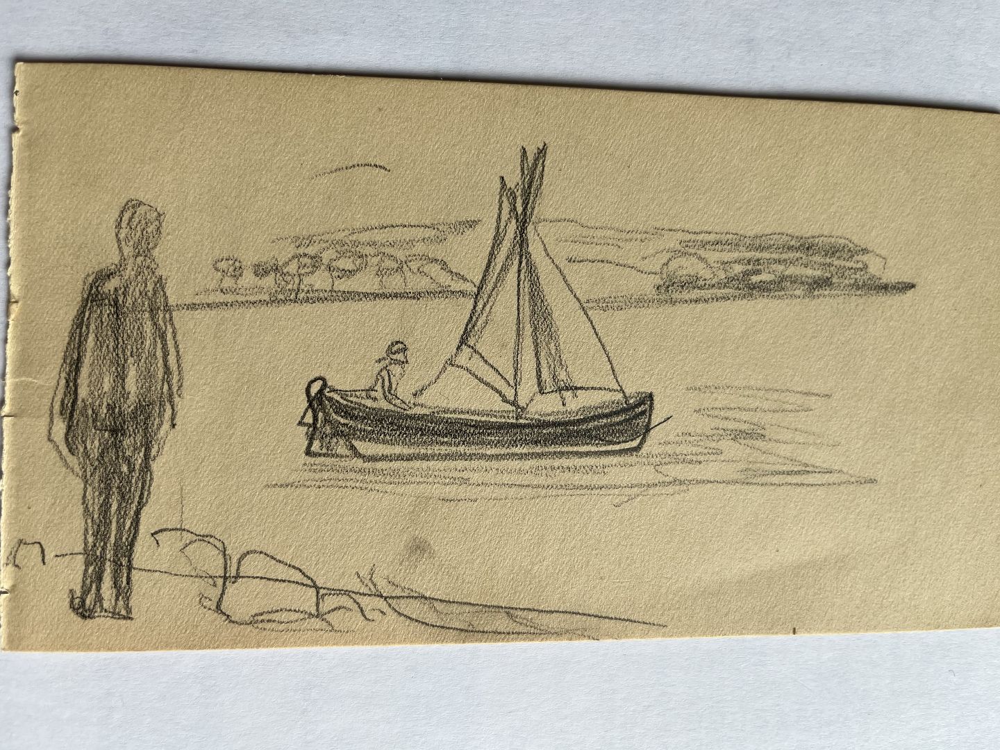 Personer i sejlbåd udfor kyst med stående person på stranden.